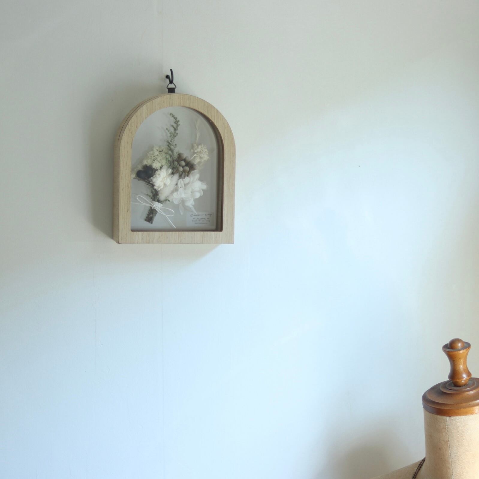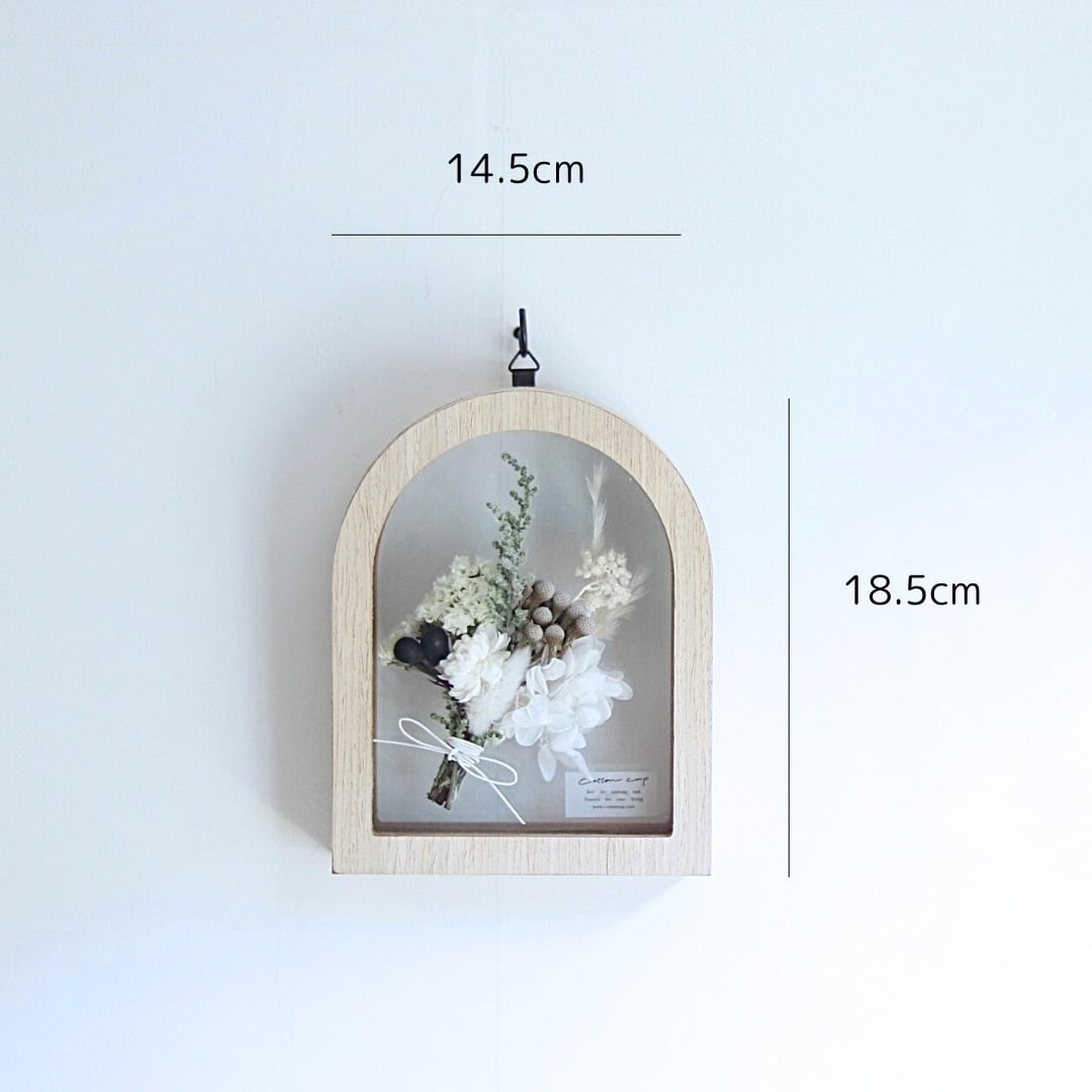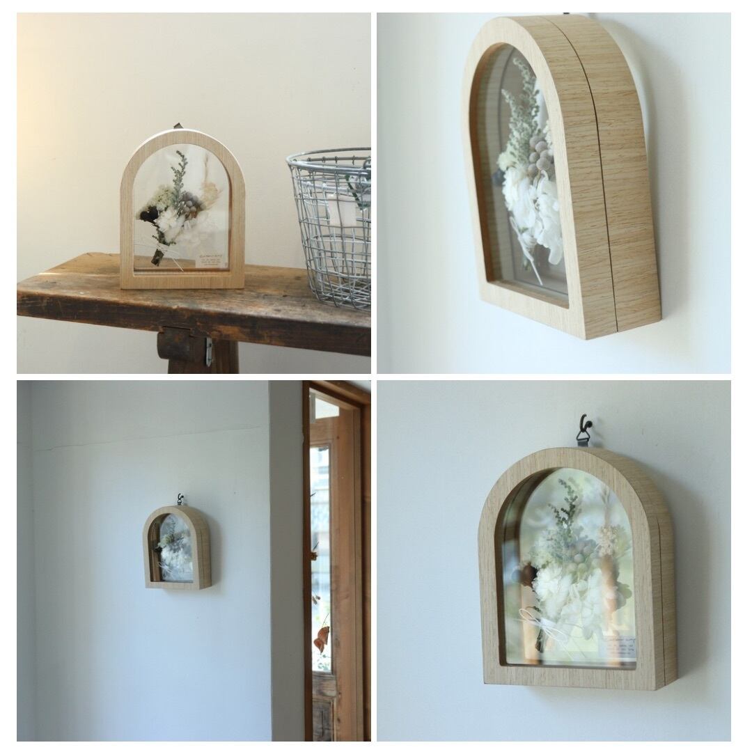 アーチ型のガラスBOXにシンプルなお花を花束風にデザインしました。