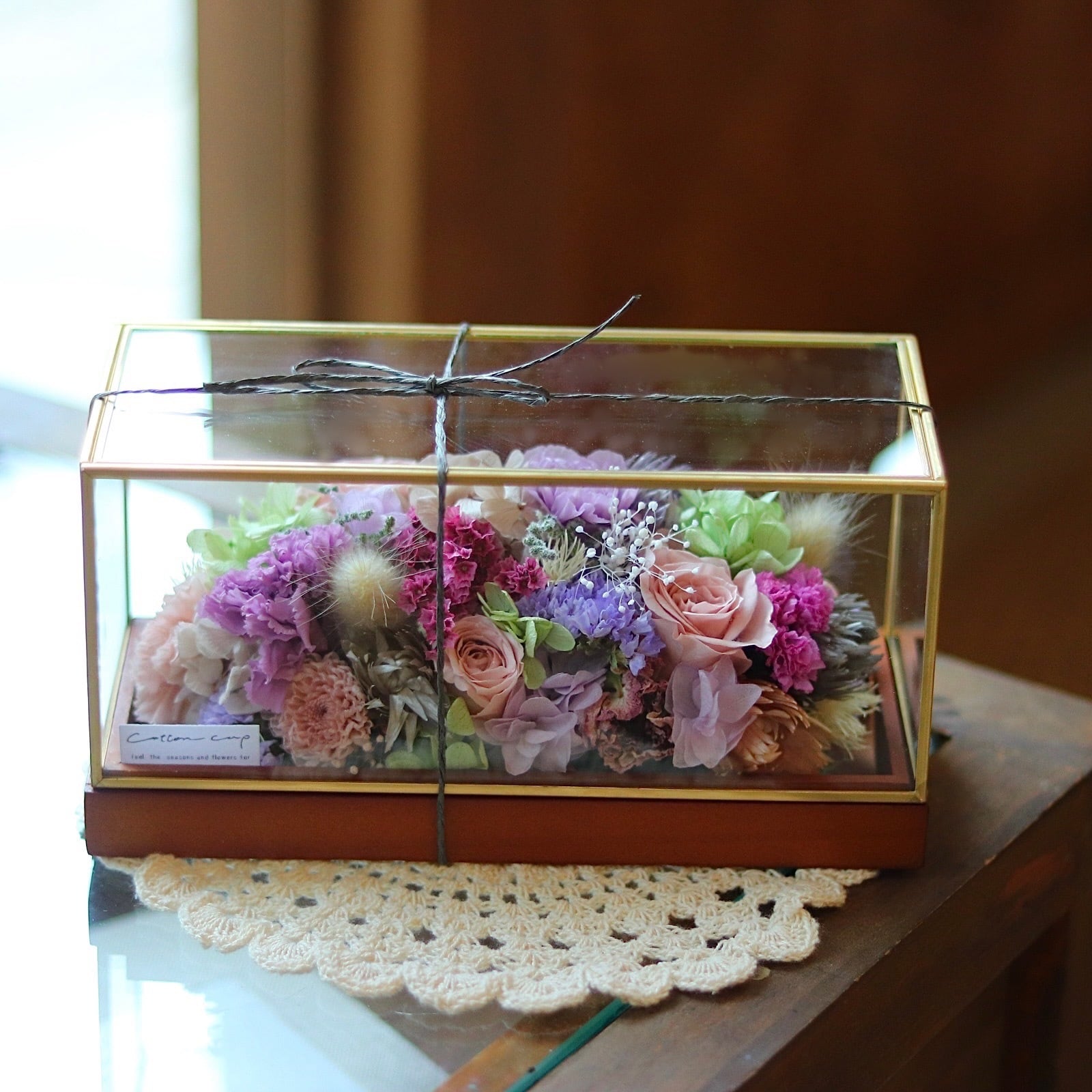ピンク系のドライフラワーのガラスBOXです。