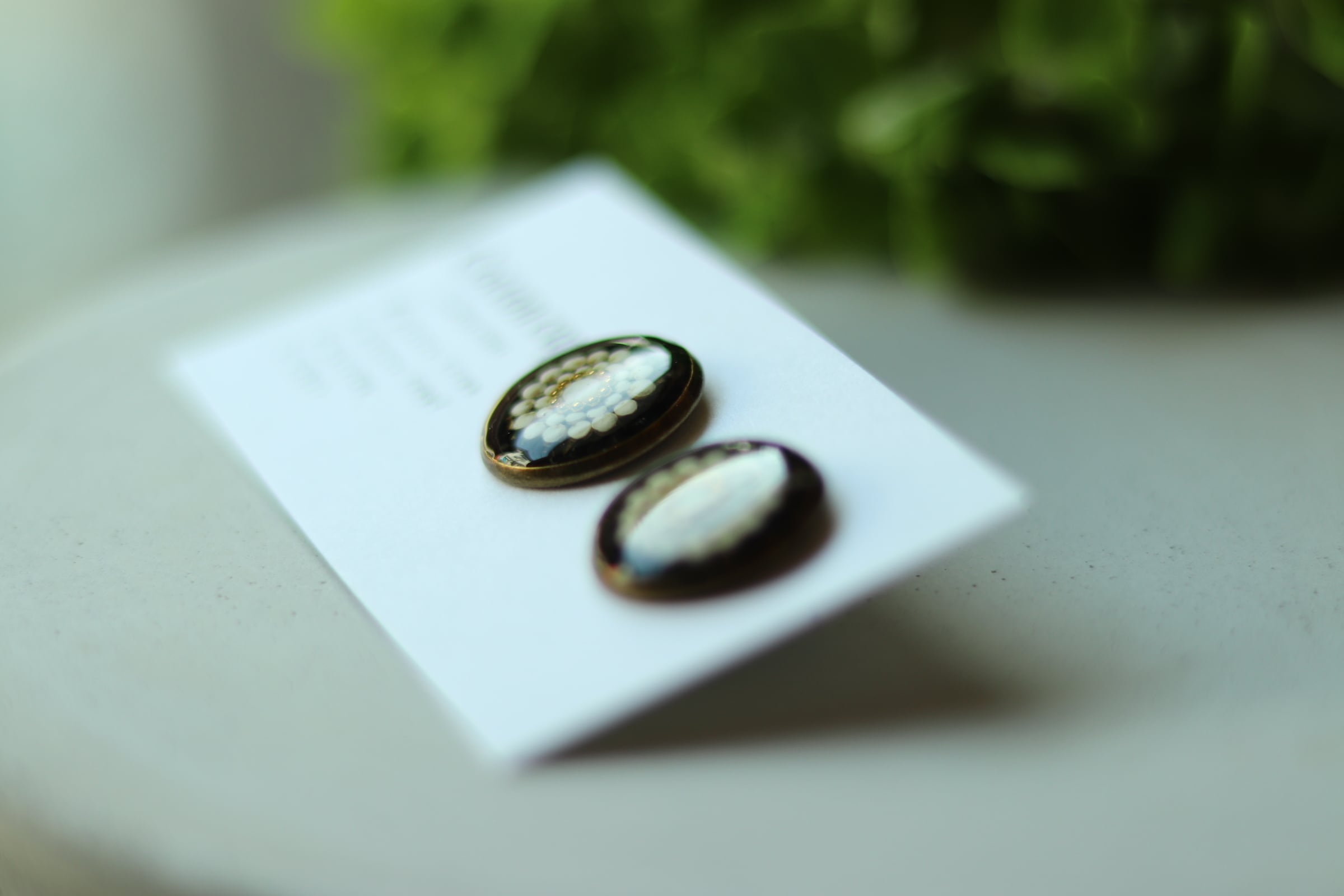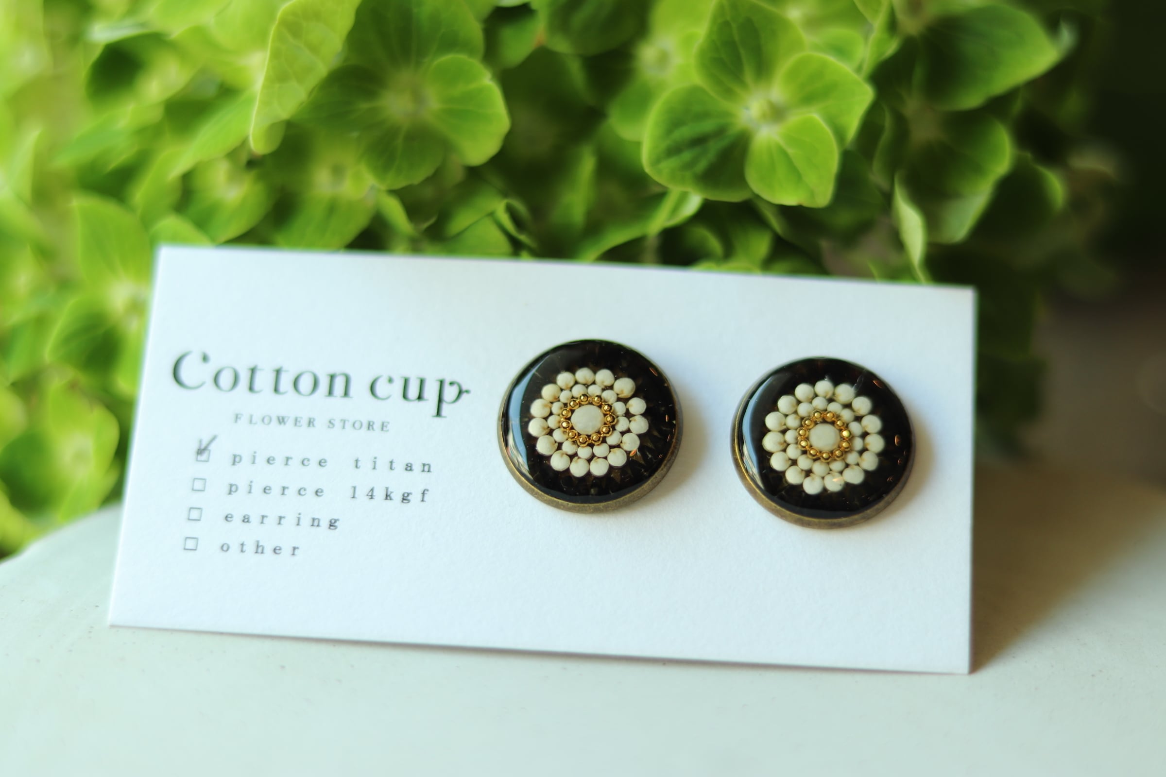 黒ごま・キヌア・など雑穀を並べて樹脂で作ったピアス・イヤリングになります。