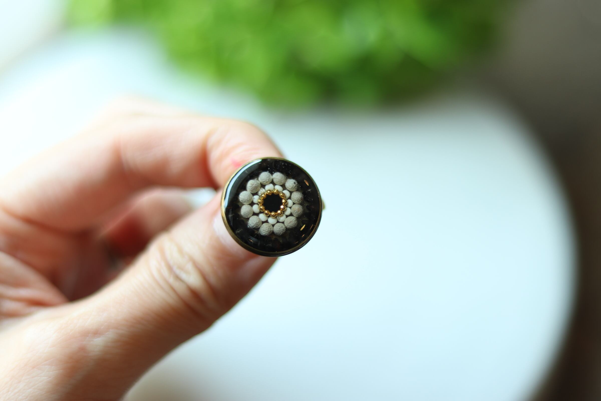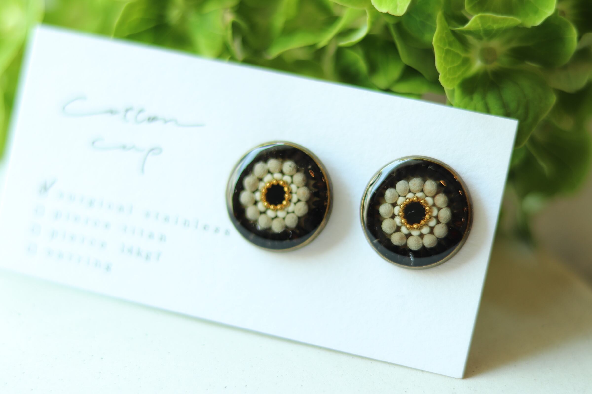 黒ごま・キヌア・エゴマなど雑穀を並べて樹脂で作ったピアス・イヤリングになります。