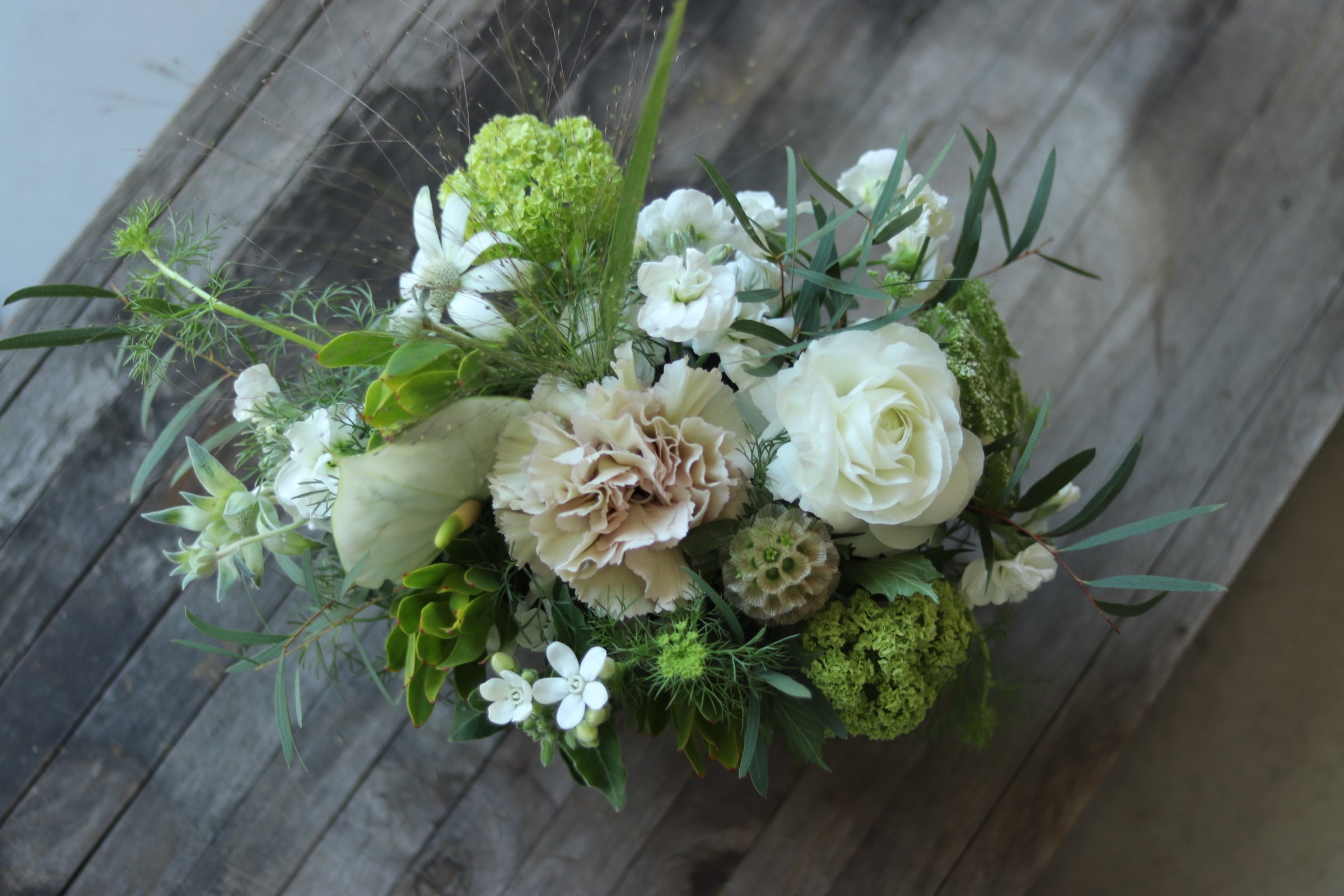 材料: スプレーストック、バラ、スモークグラス、クーゲル、リューカデンドロン、アンスリウム、ホワイトスター、スノーボール、レースフラワー、カーネーション