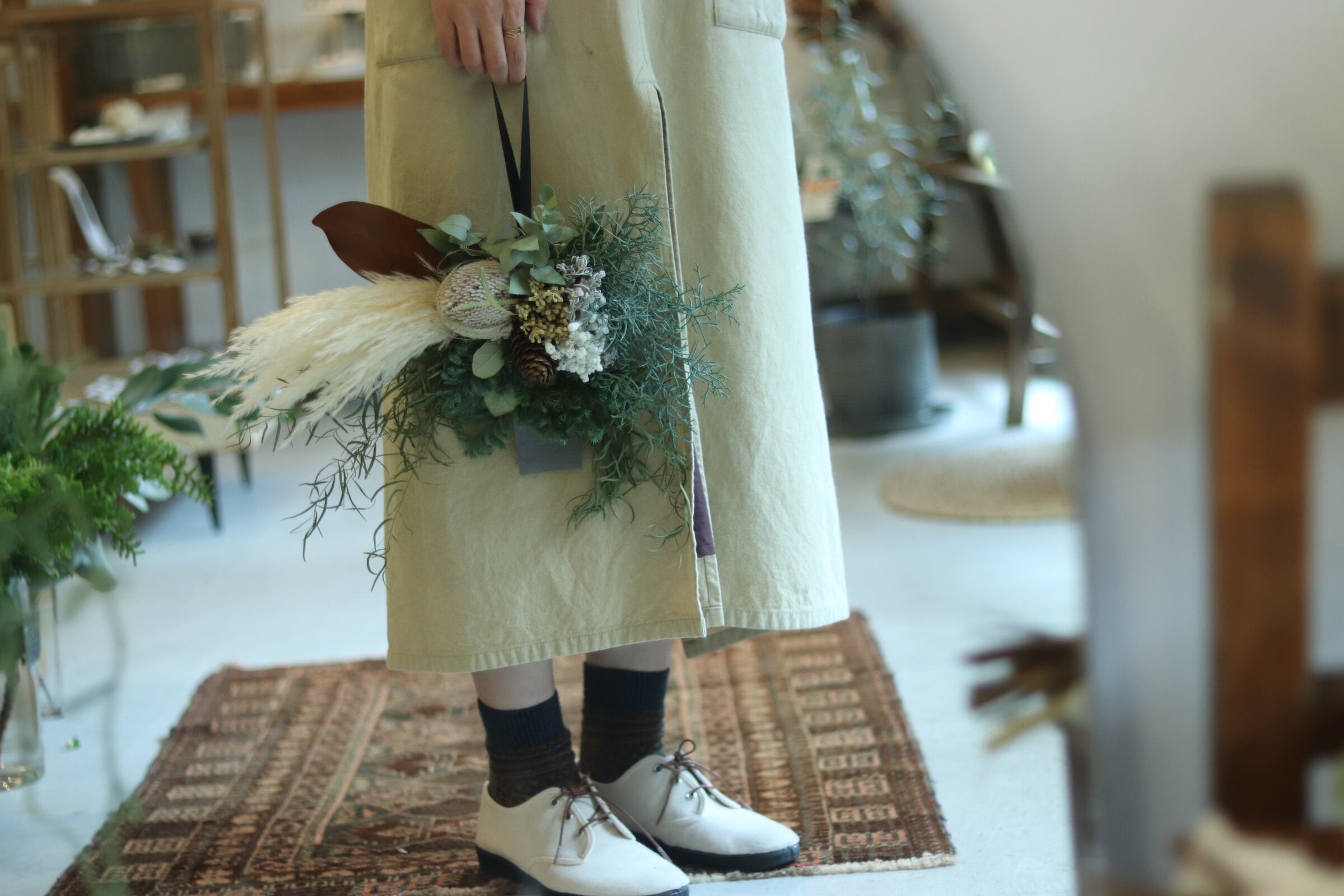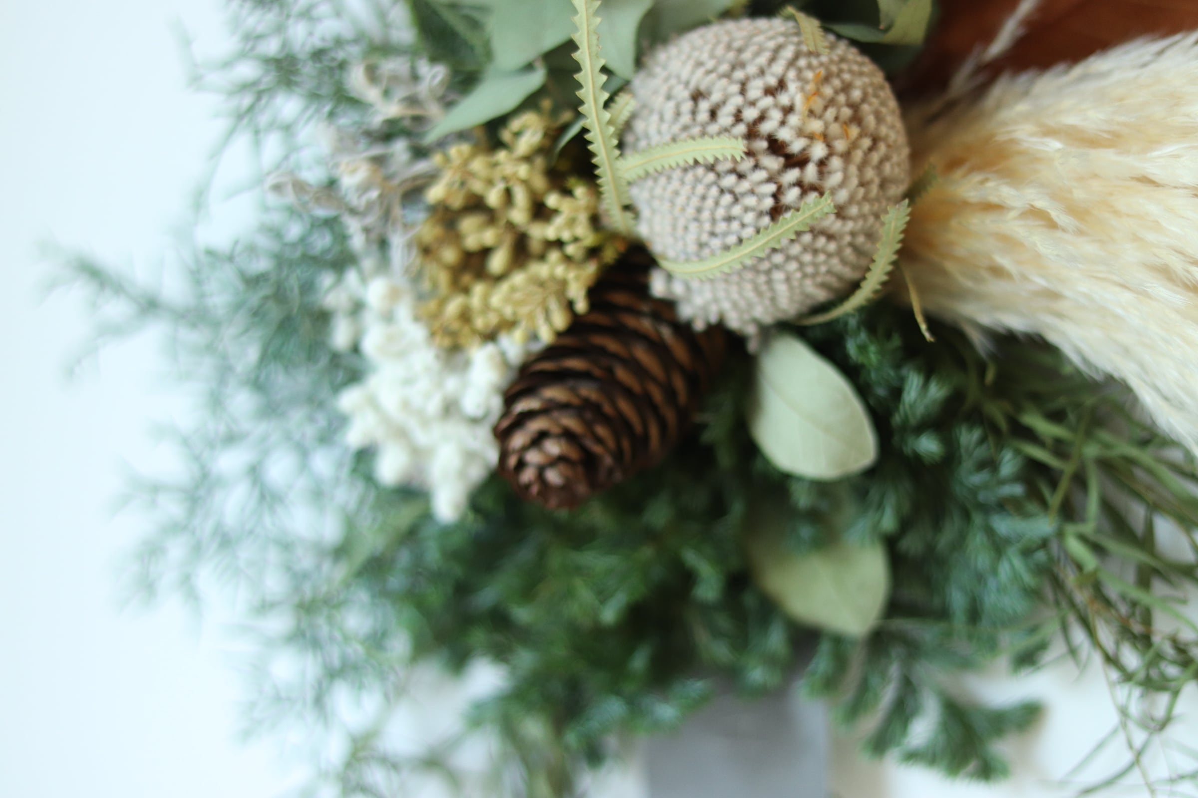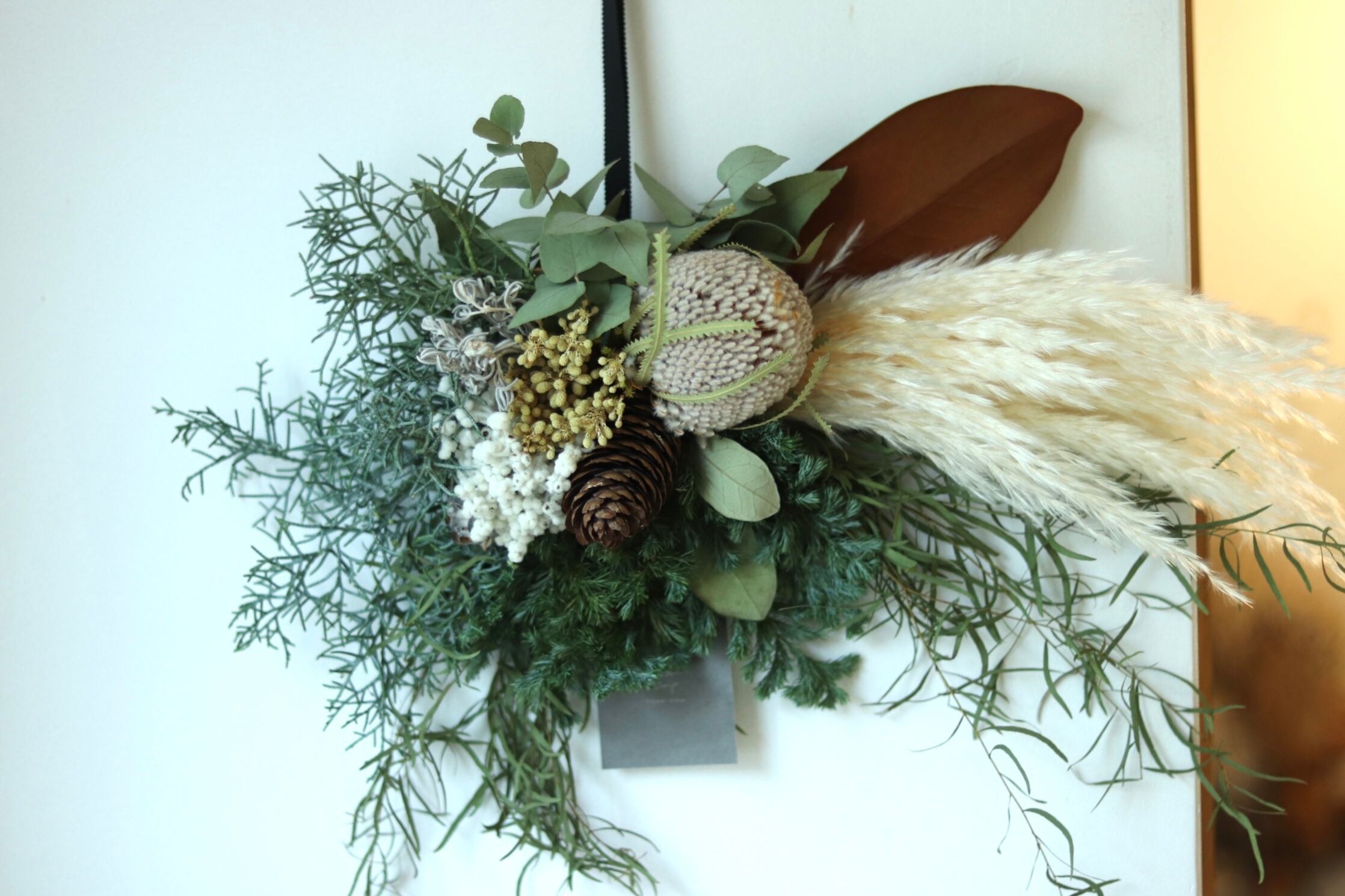 材料: ユーカリ、バンクシア、パンパス、バーゼリア、サゴブッシュ、ブルーアイス他