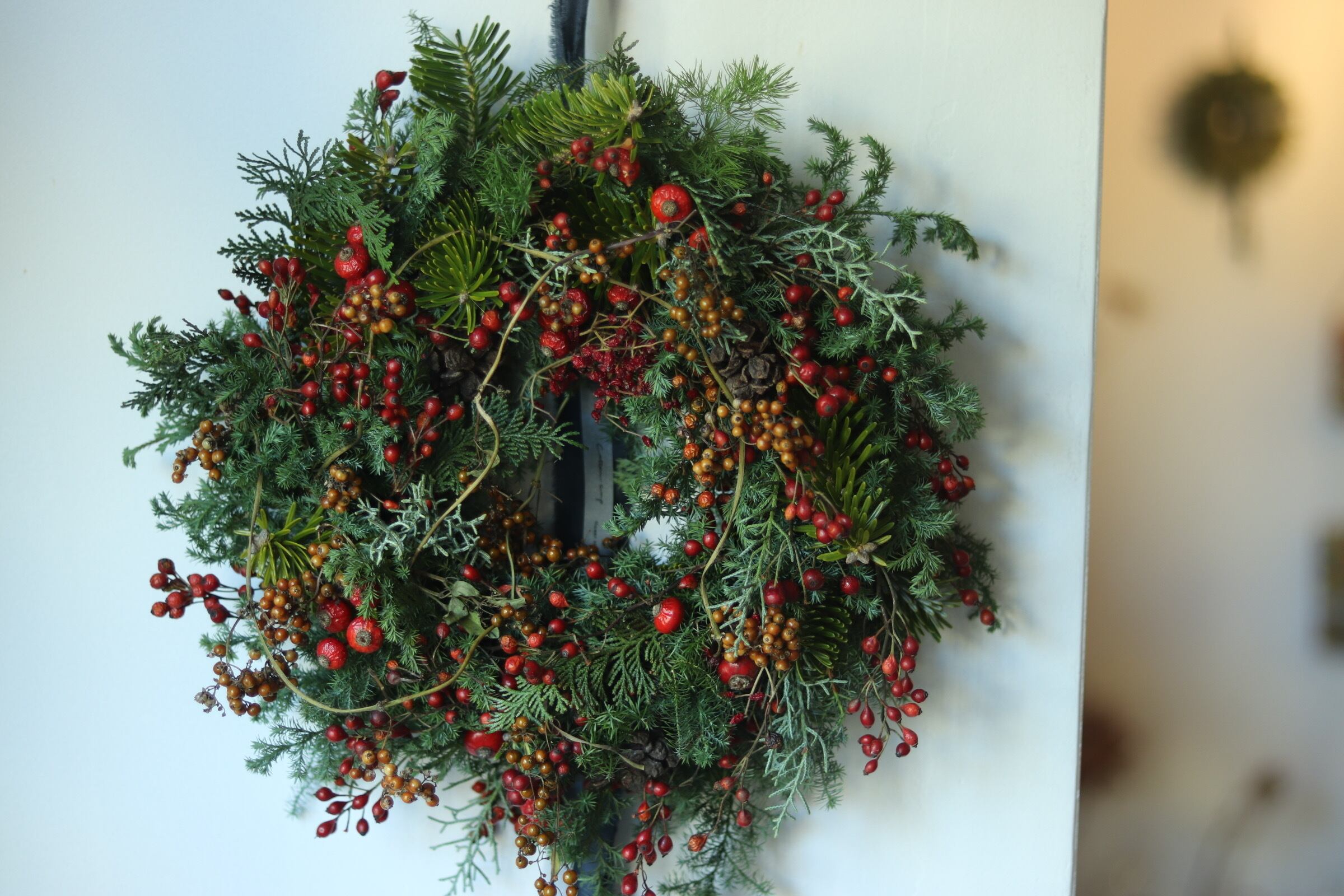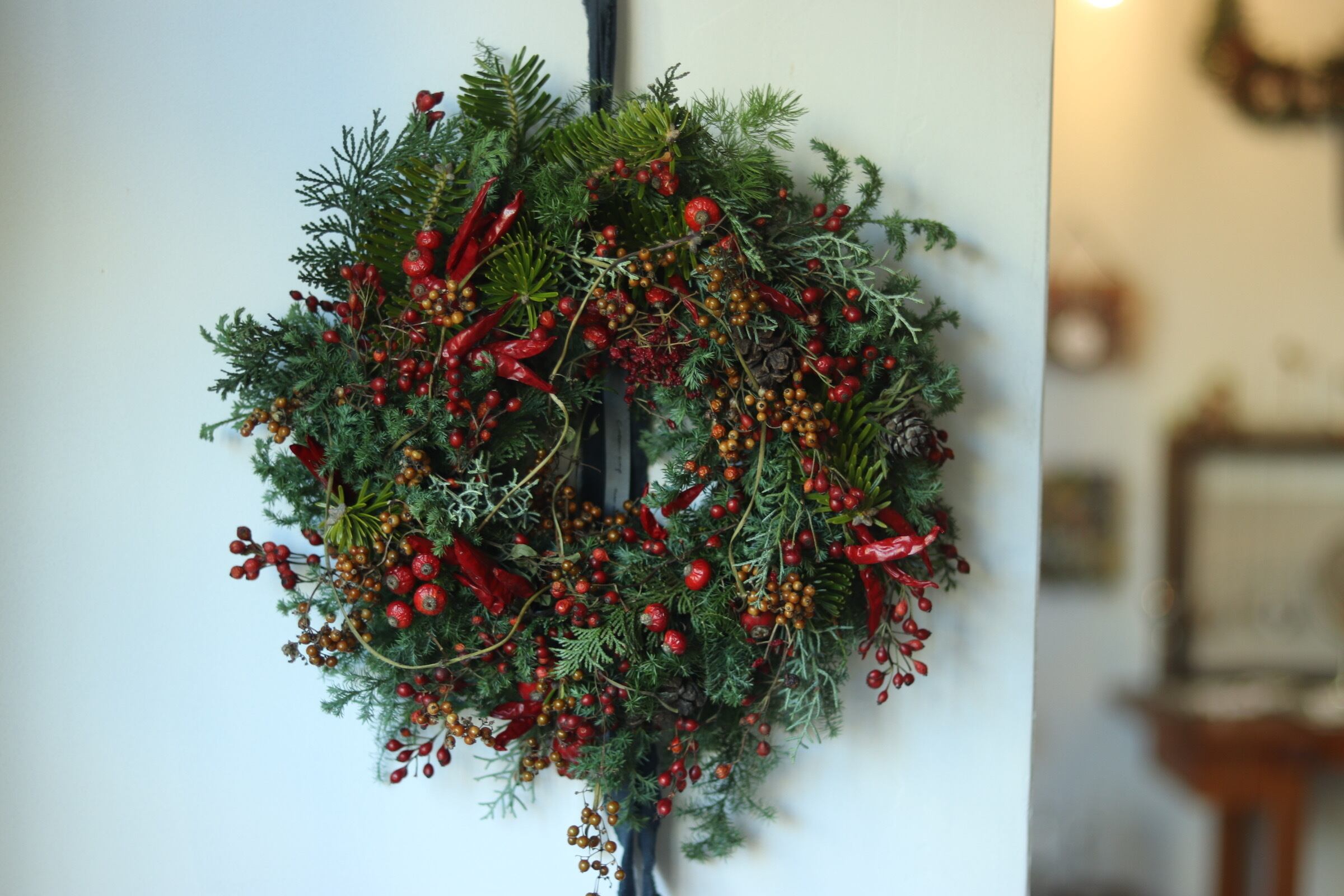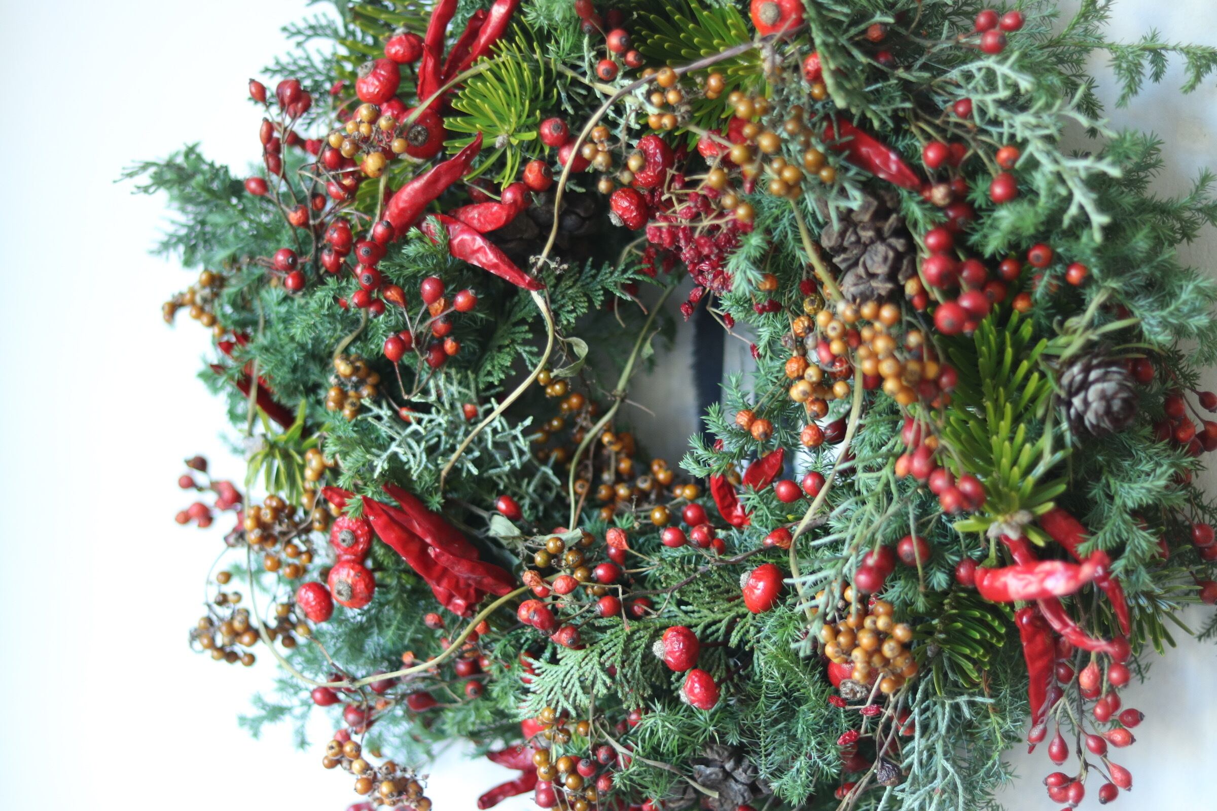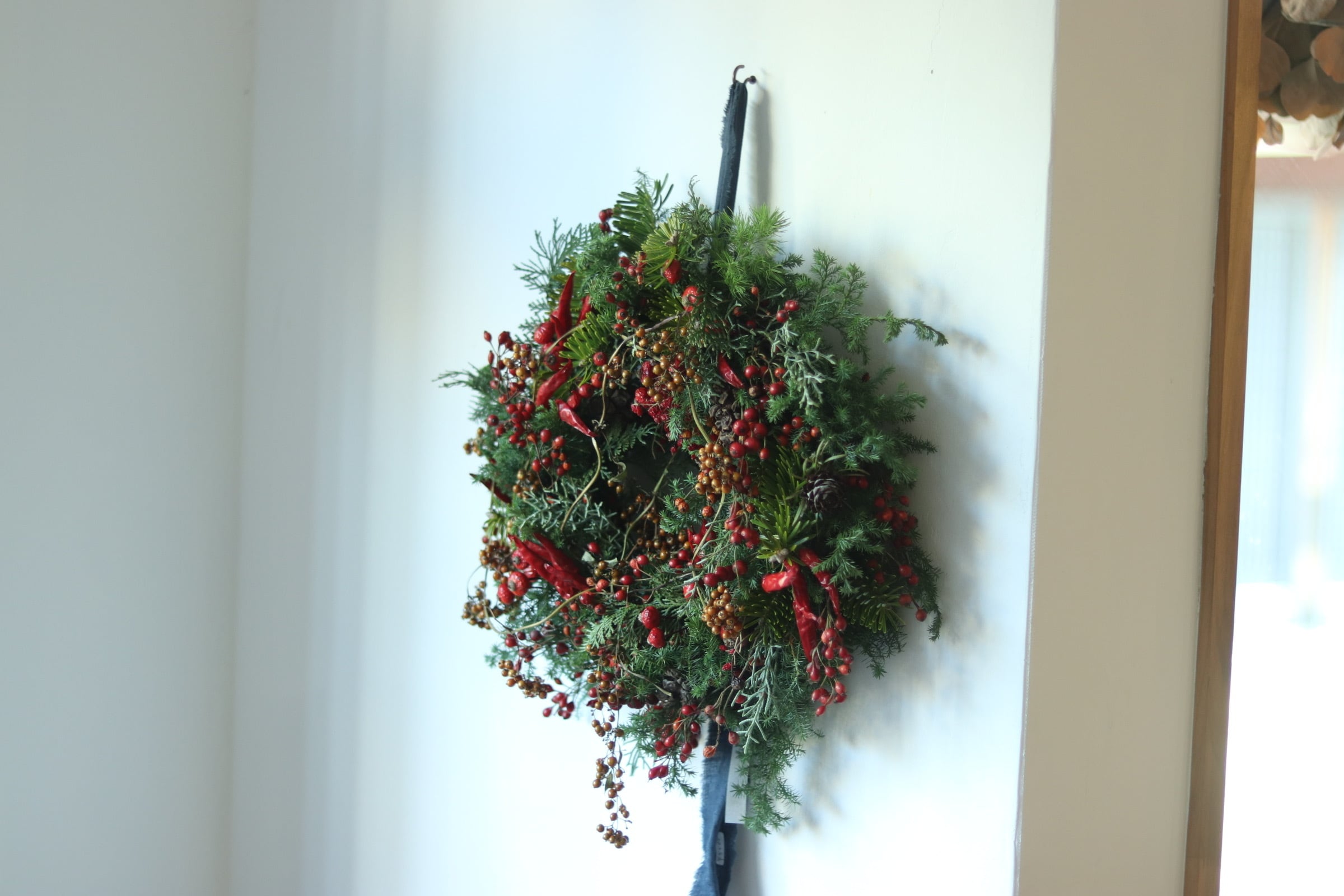 材料: ヒムロスギ、バラの実、ノバラ、ブルーアイス、ヘクソカズラ、トウガラシ他