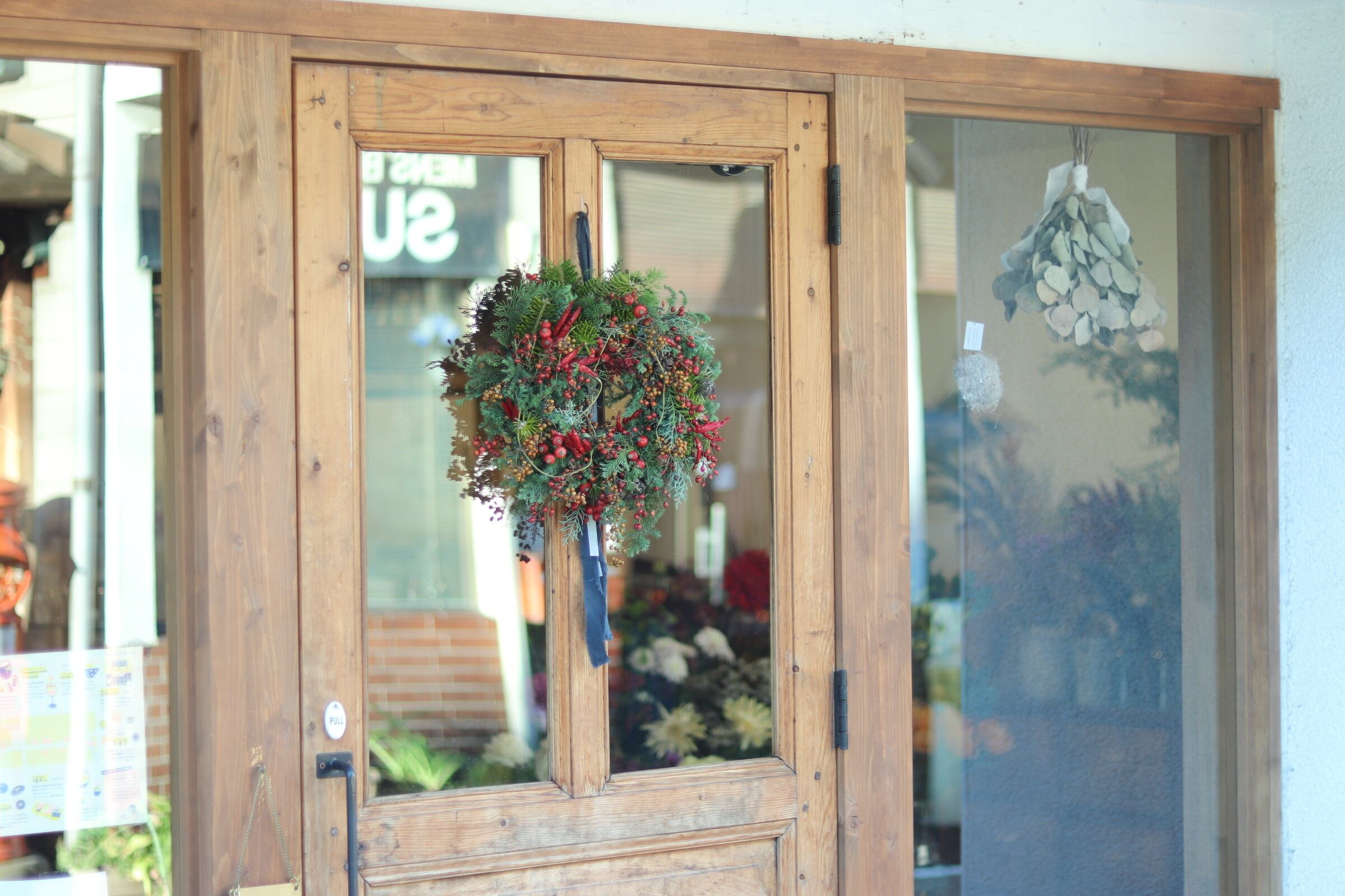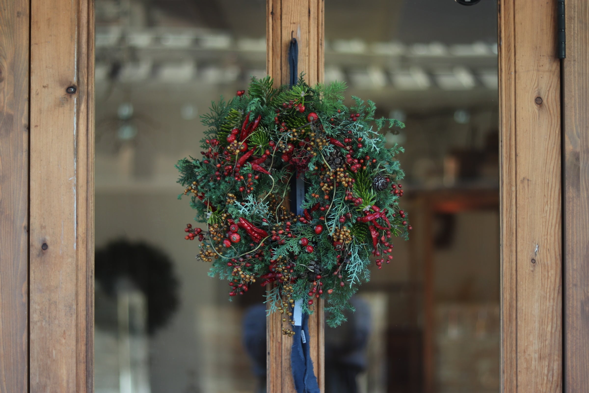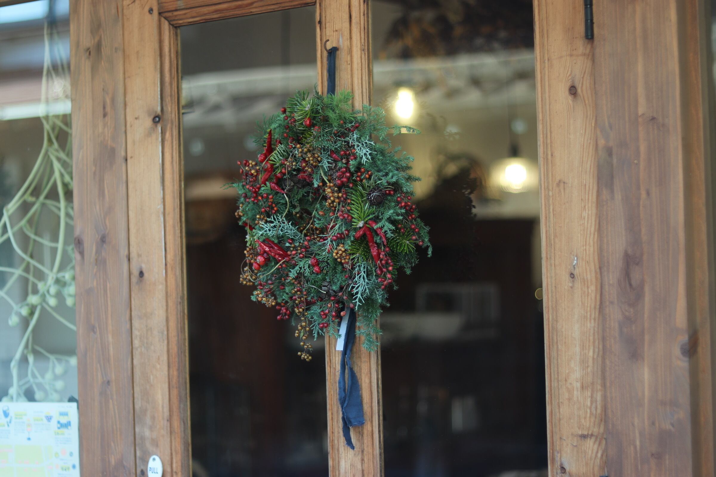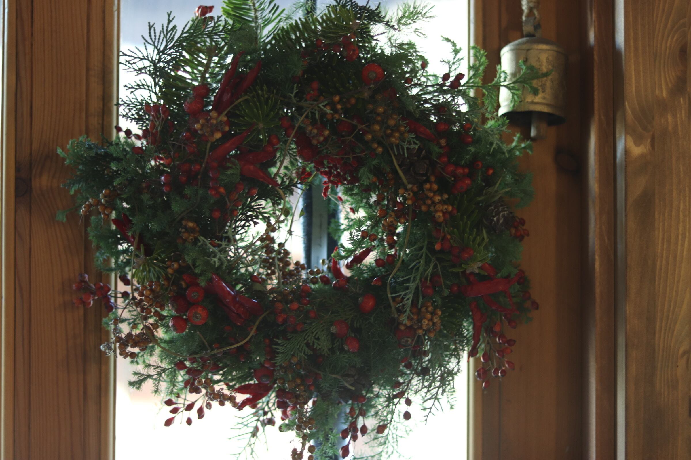 材料: ヒムロスギ、バラの実、ノバラ、ブルーアイス、ヘクソカズラ、トウガラシ他