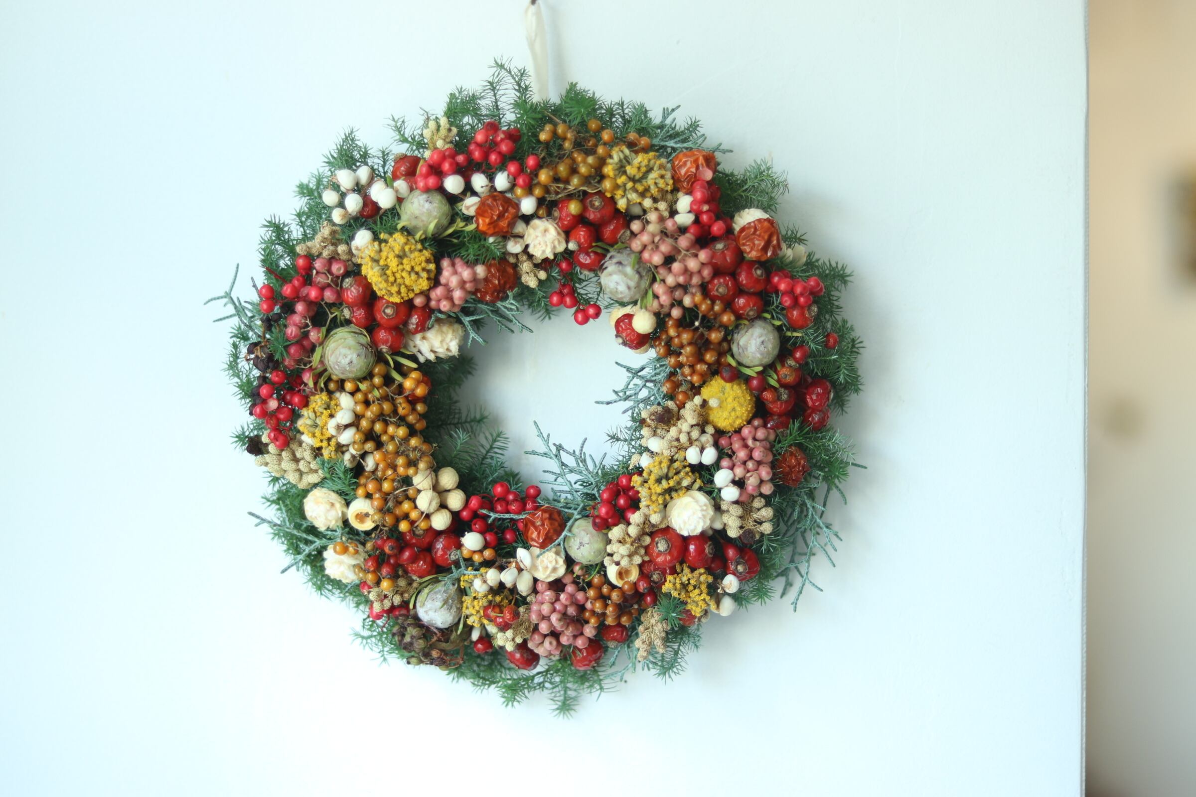 材料: 野バラ、ペッパーベリー、ヘクソカズラ、アキレア、さつま杉、ブルーアイス、バーゼリア、千日紅、グラスペディア、ナンキンハゼ、とうがらし