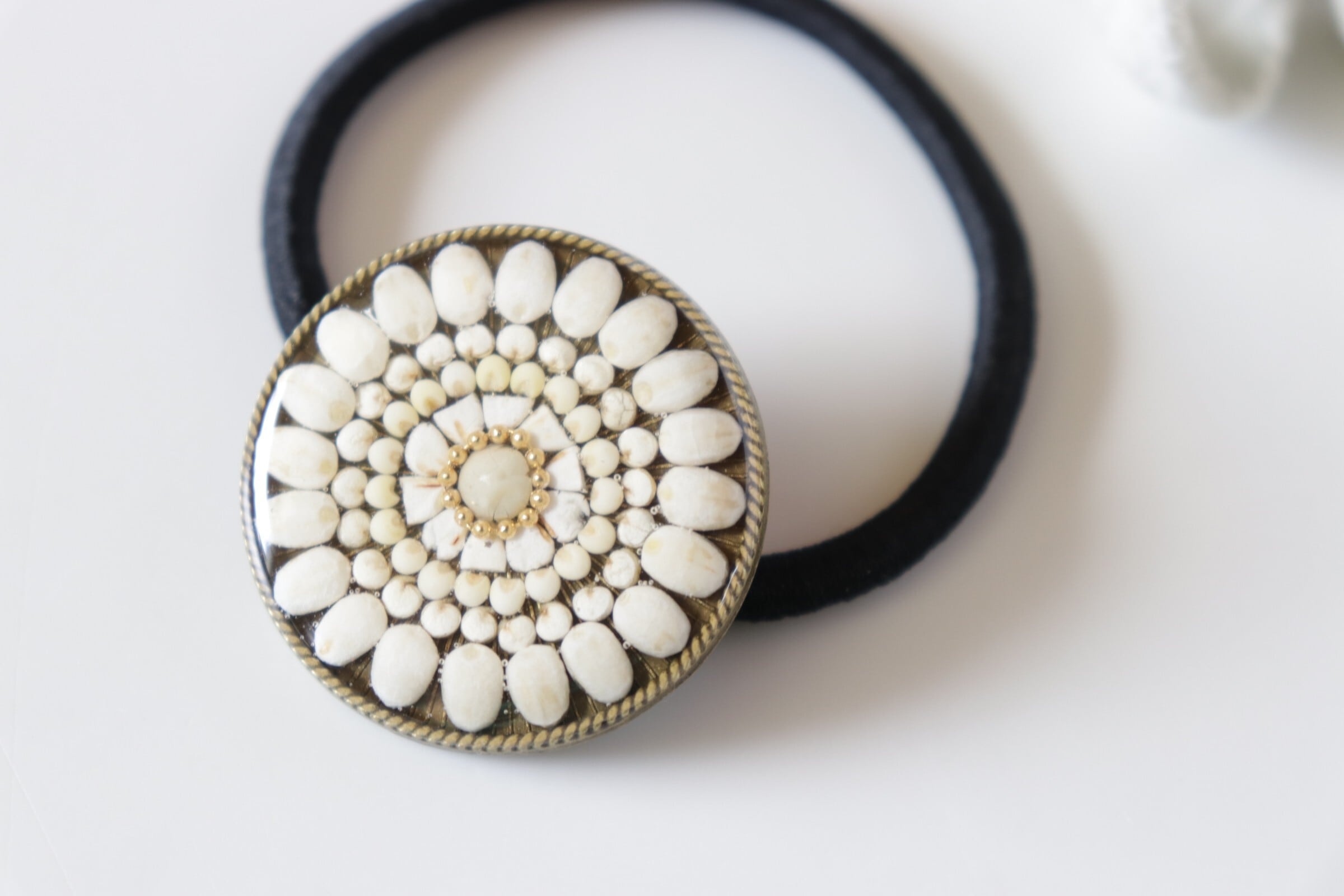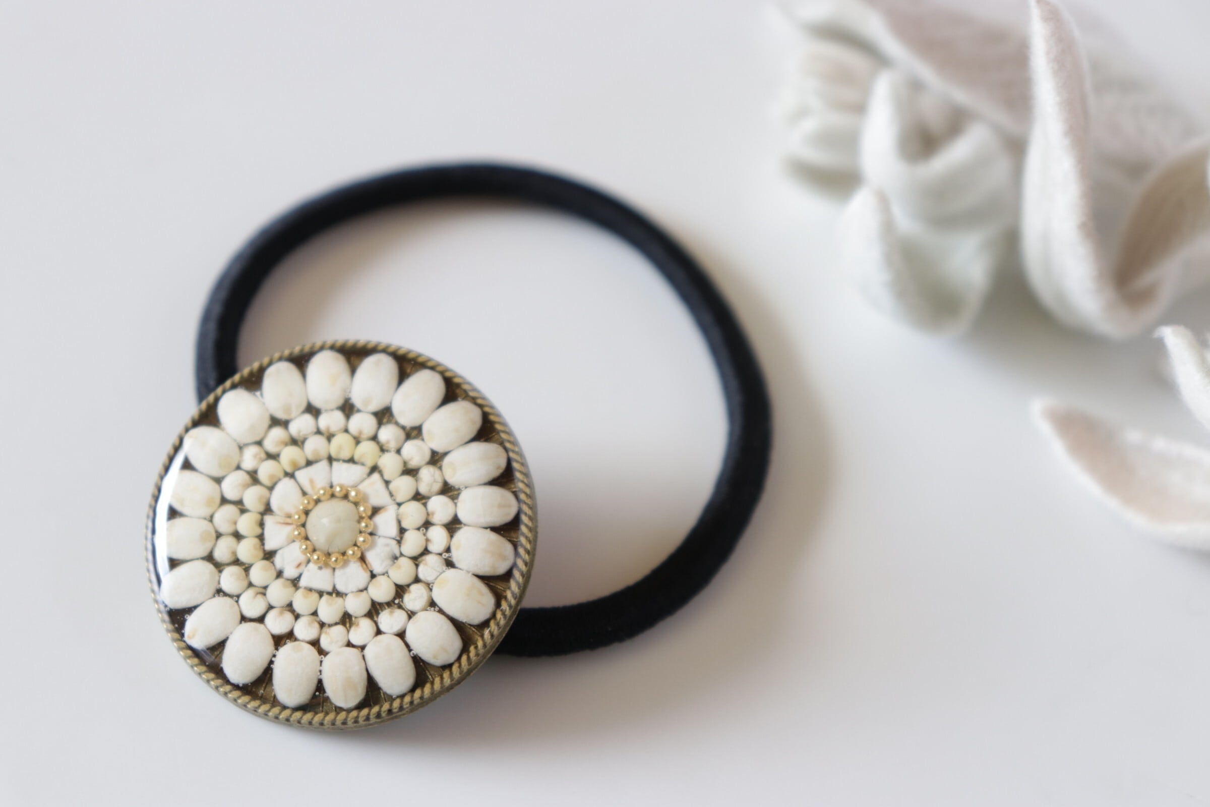 白米・キヌア・など雑穀を並べて樹脂をコーティングしたヘアゴムです。