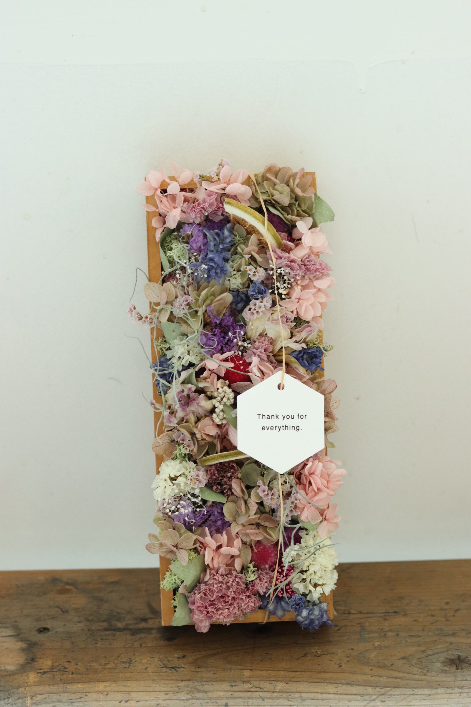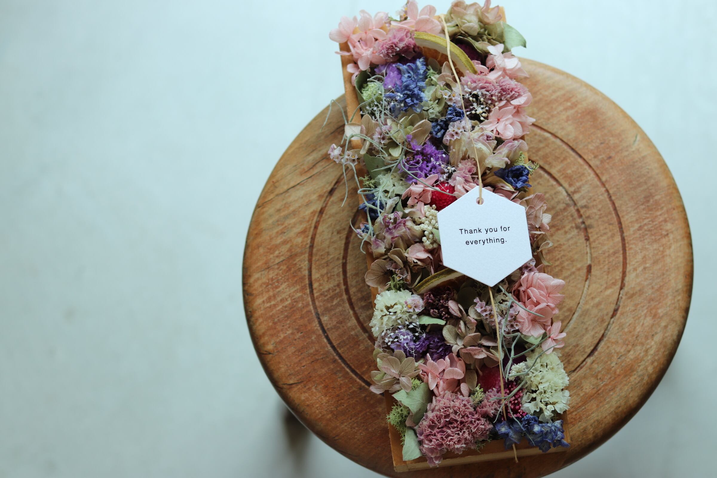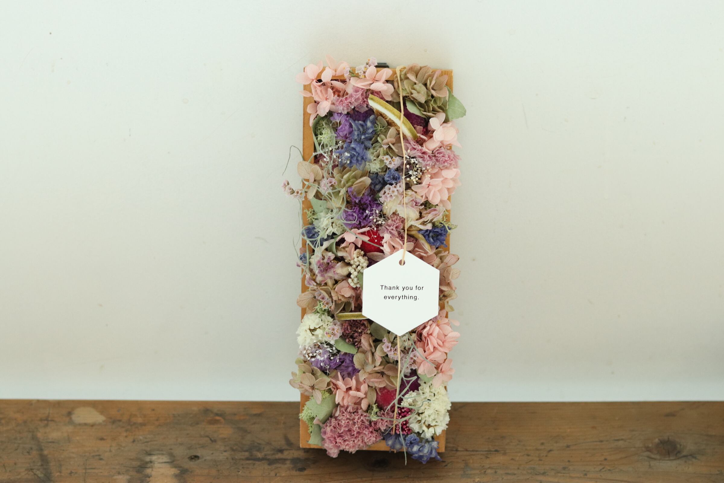 たくさんのドライフラワーを木のBoxに詰め込みました。