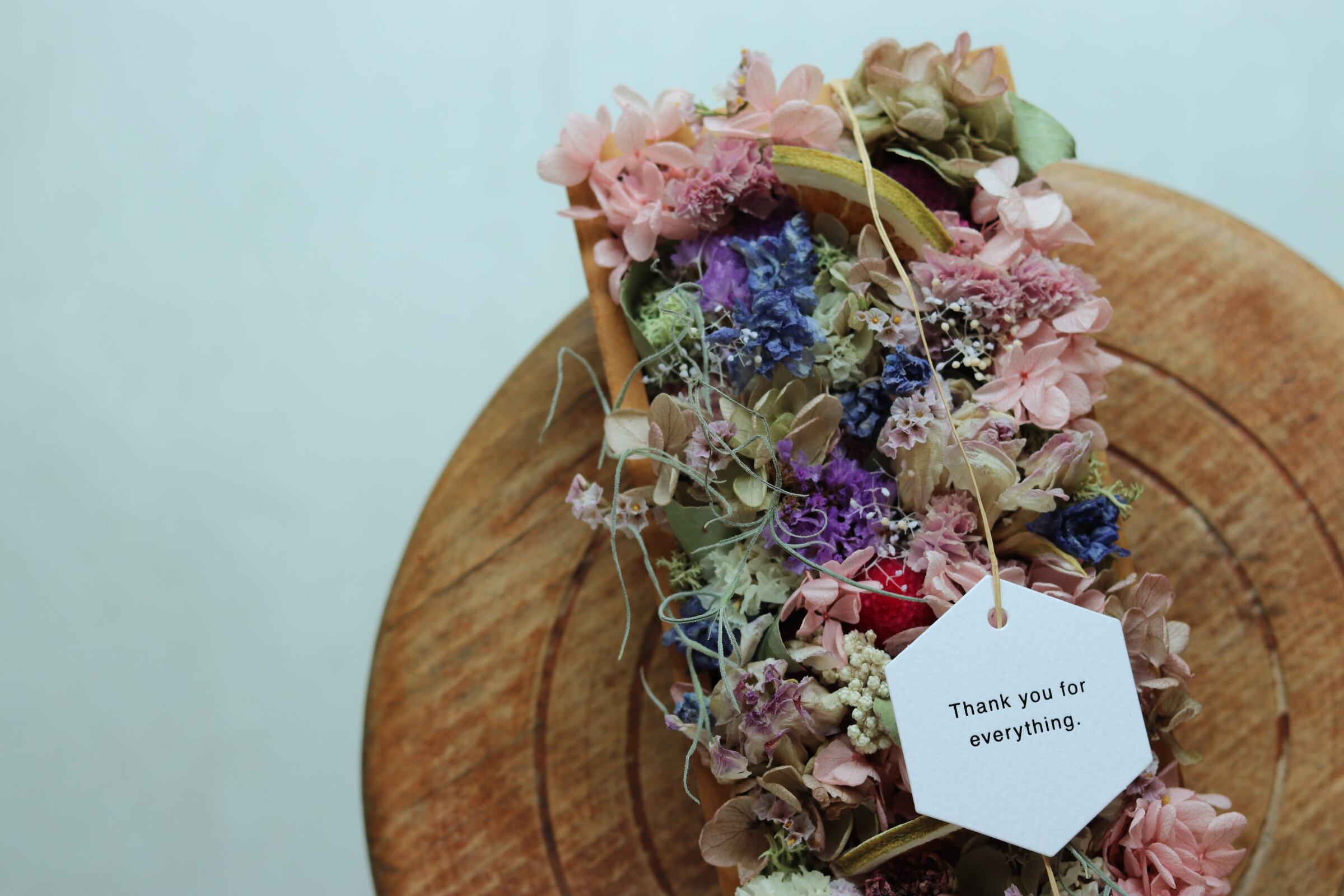 材料: 紫陽花、スターチス、ハイブリッドスターチス、デルフィニウム、千日紅、エアプランツ、チューリップ、かすみ草、モス、 他