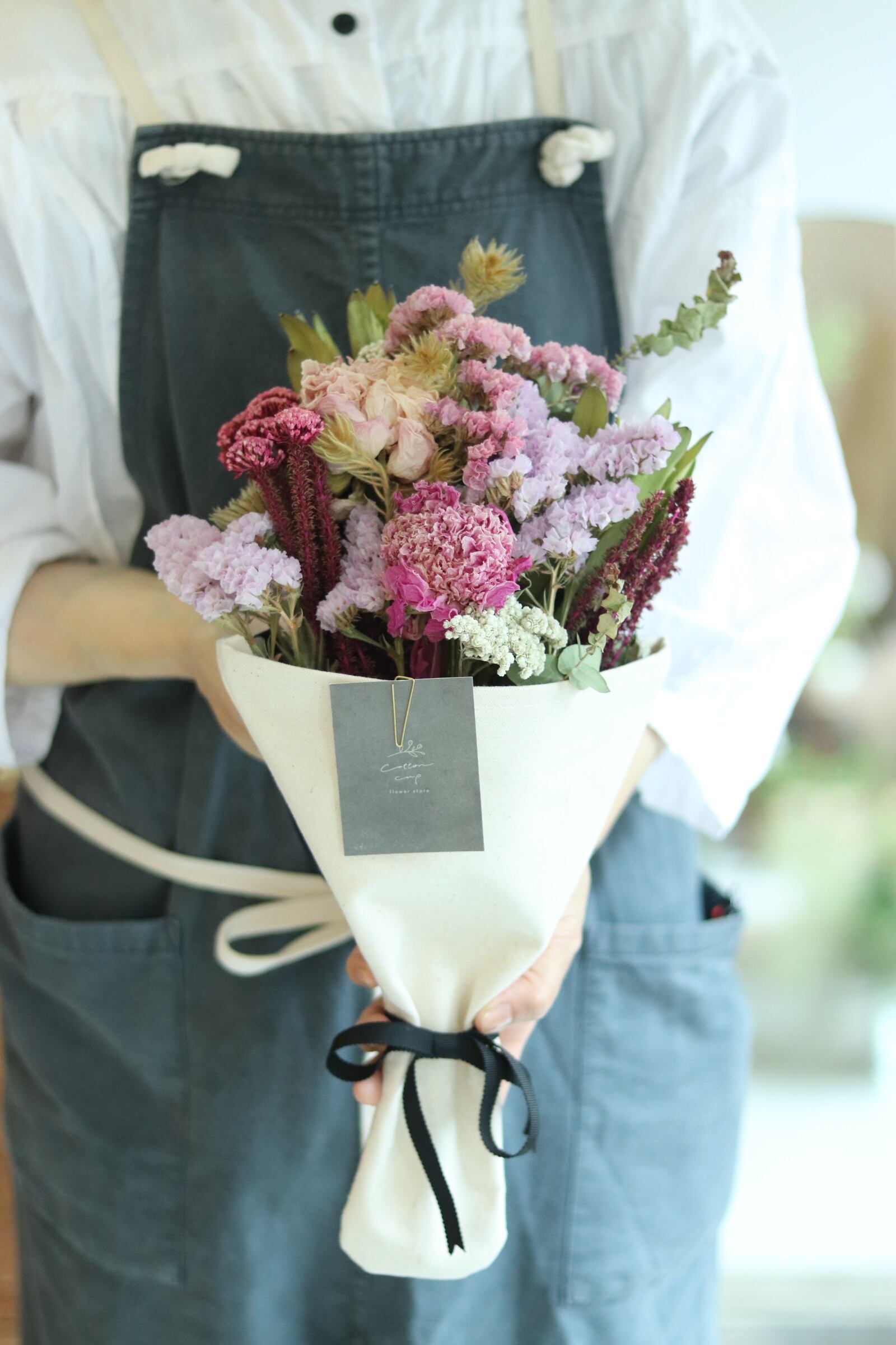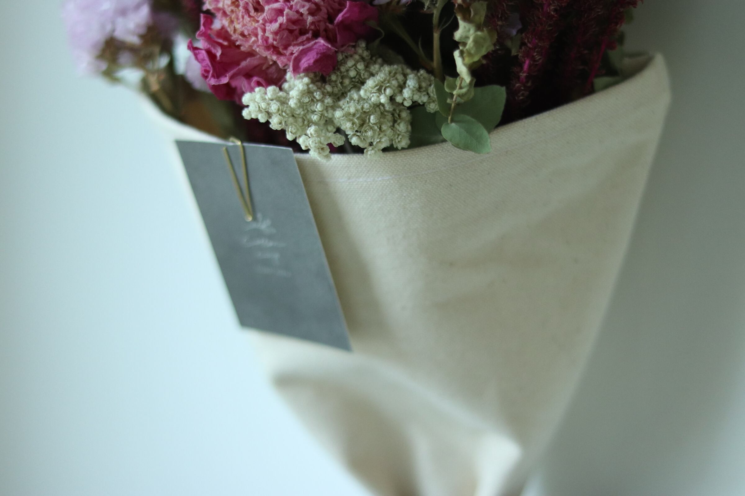 材料: シャクヤク、スターチス、リューカデンドロン、ライスフラワー、フィリカ、ユーカリ 他