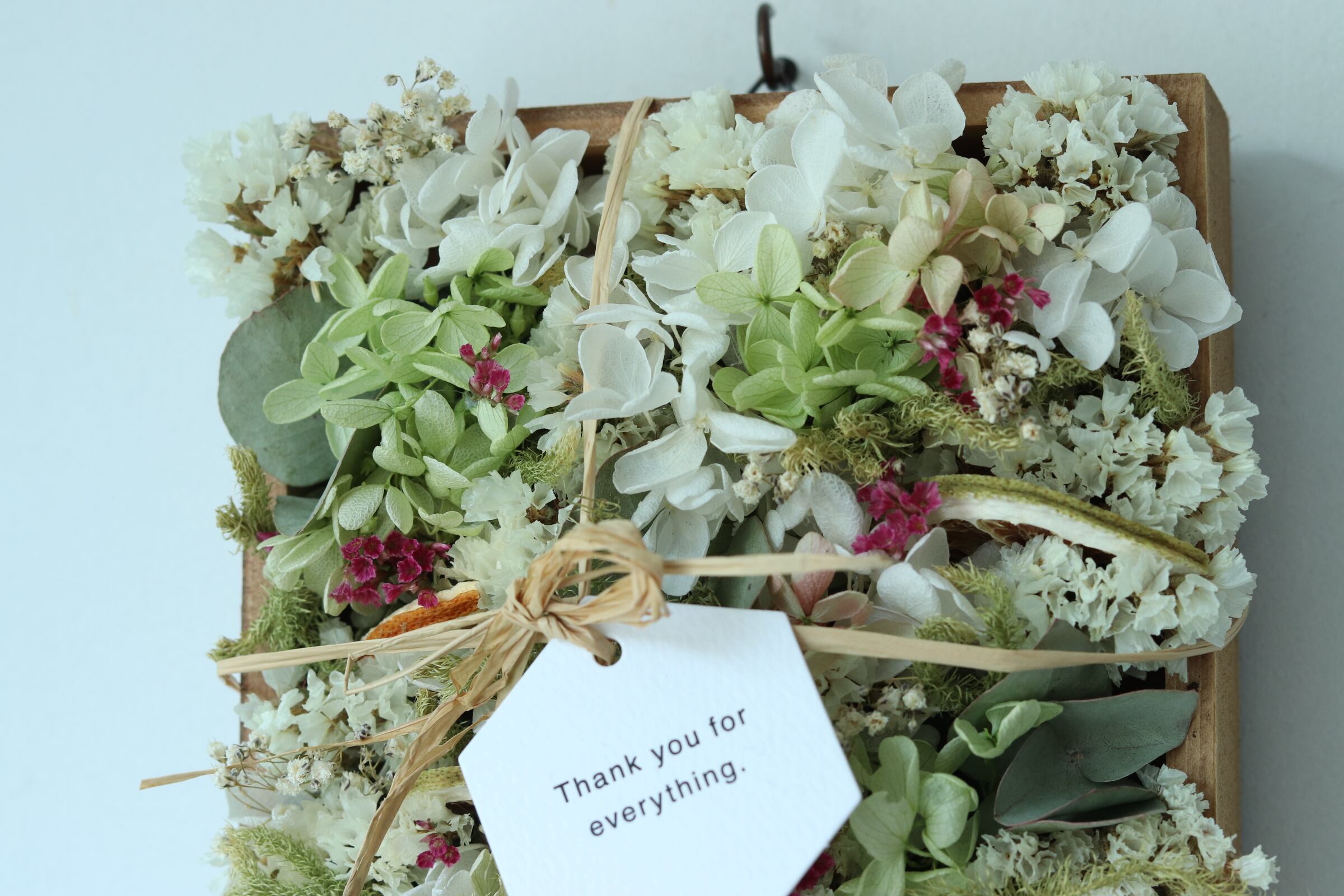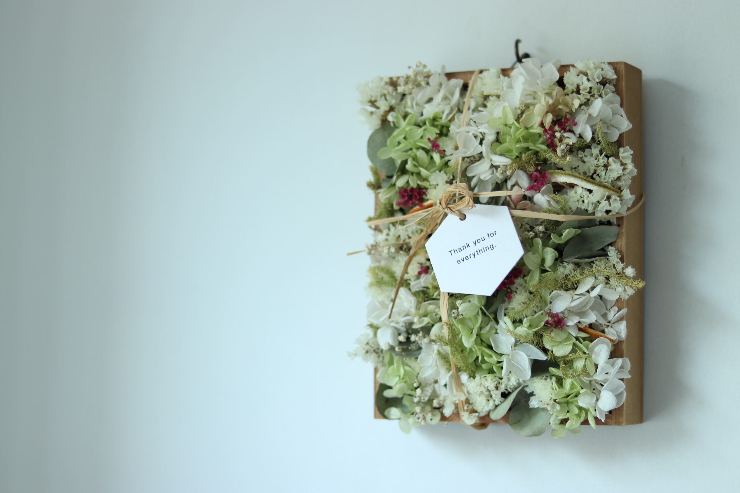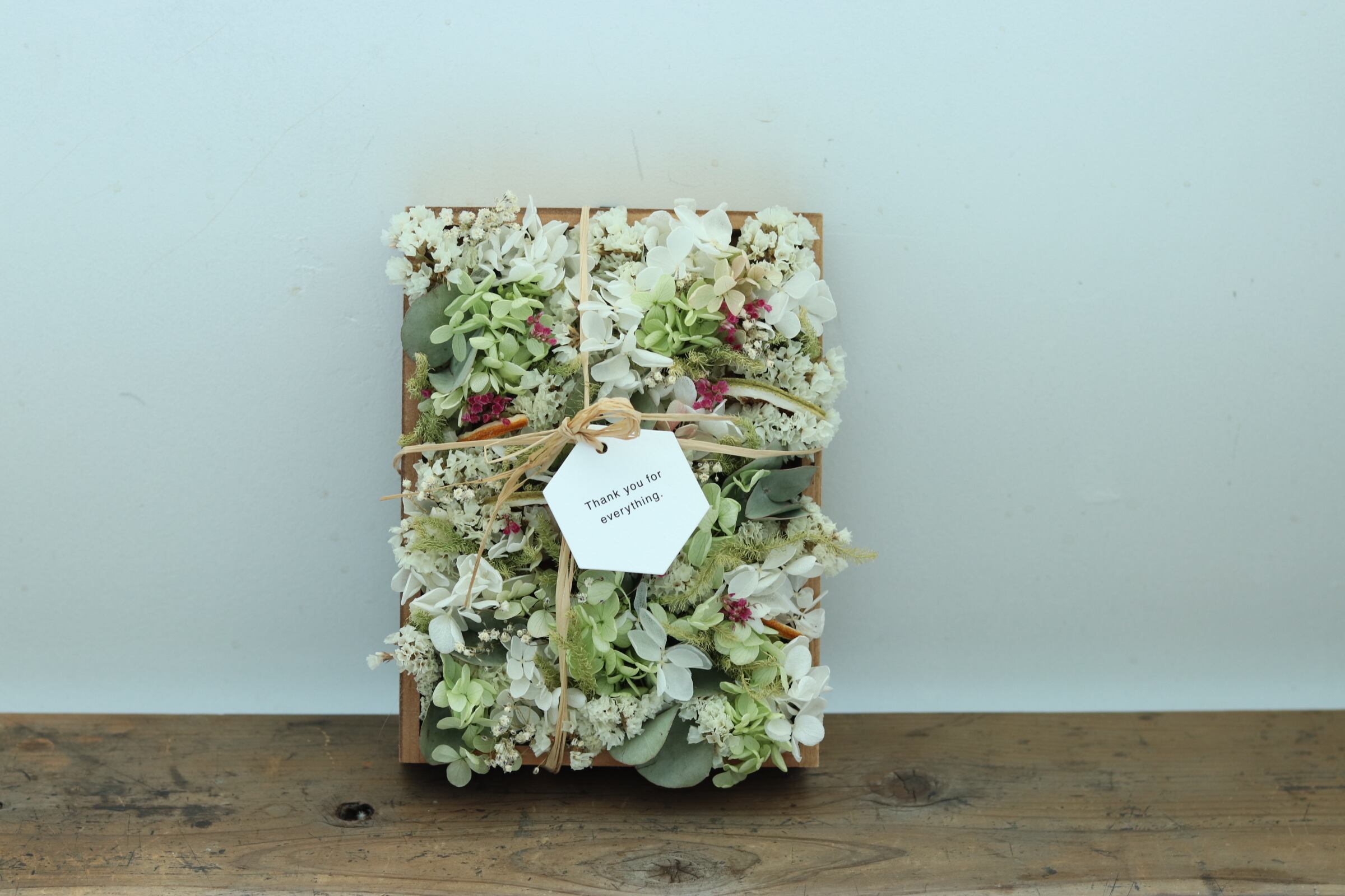 たくさんのドライフラワーを木のBoxに詰め込みました。