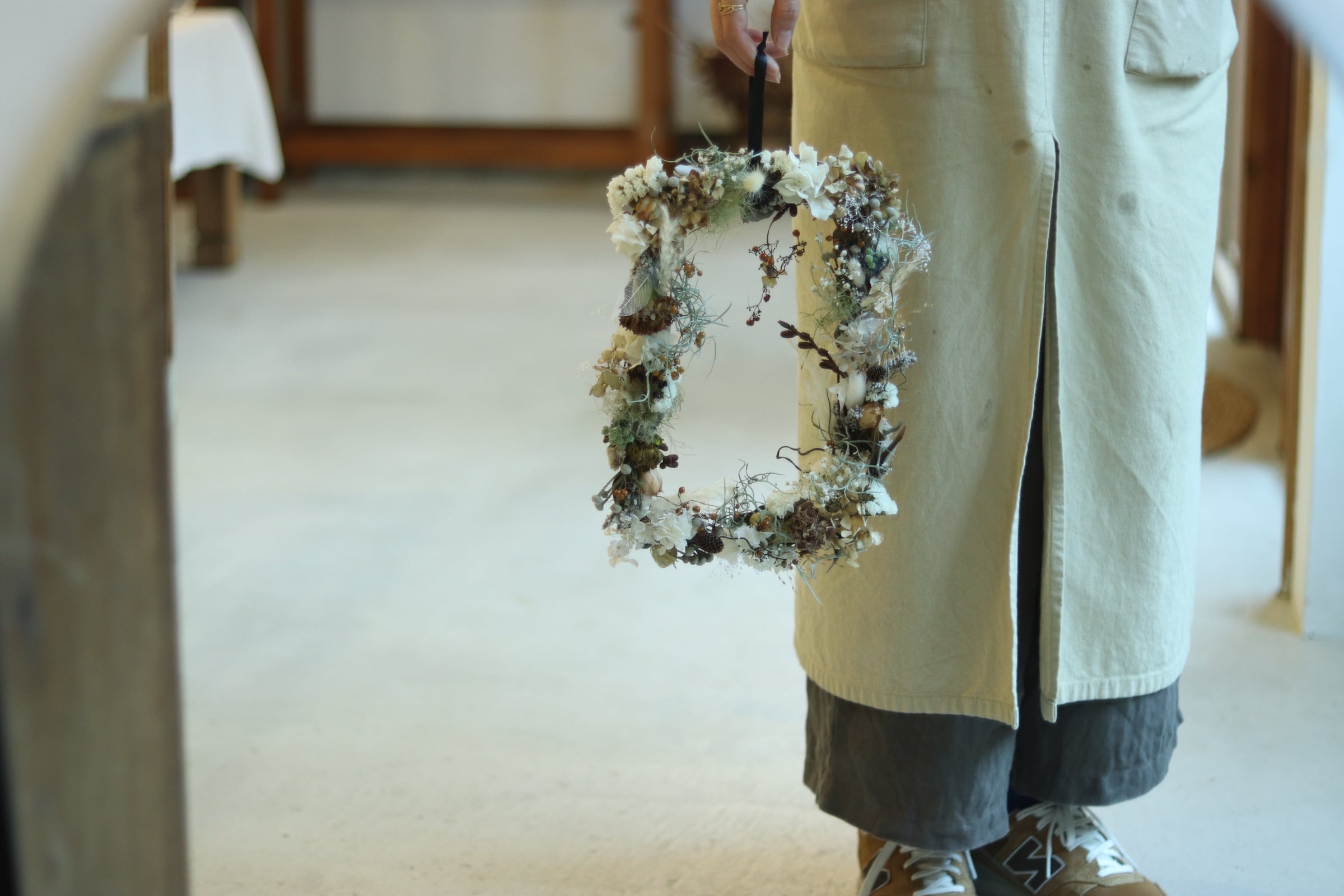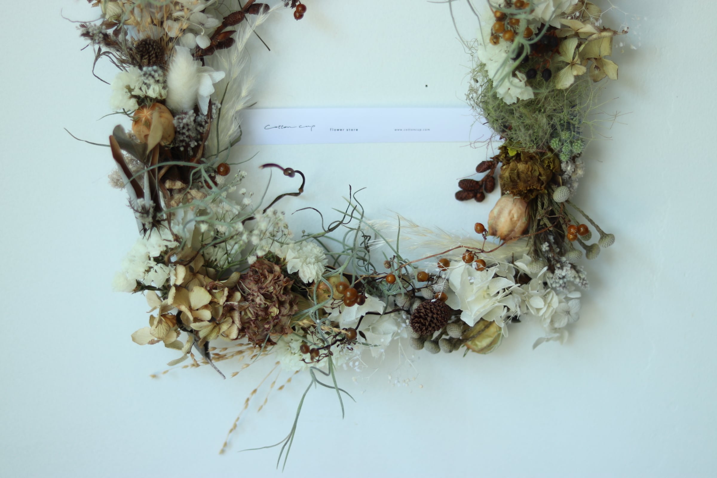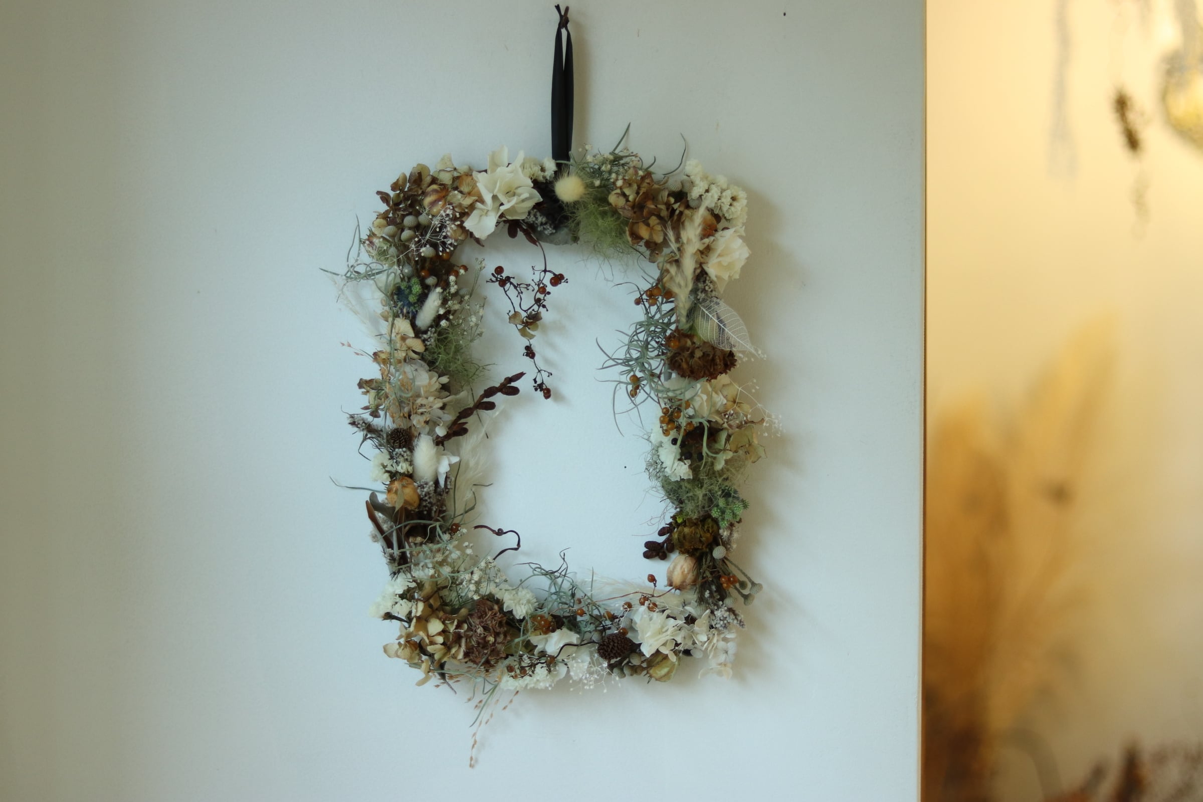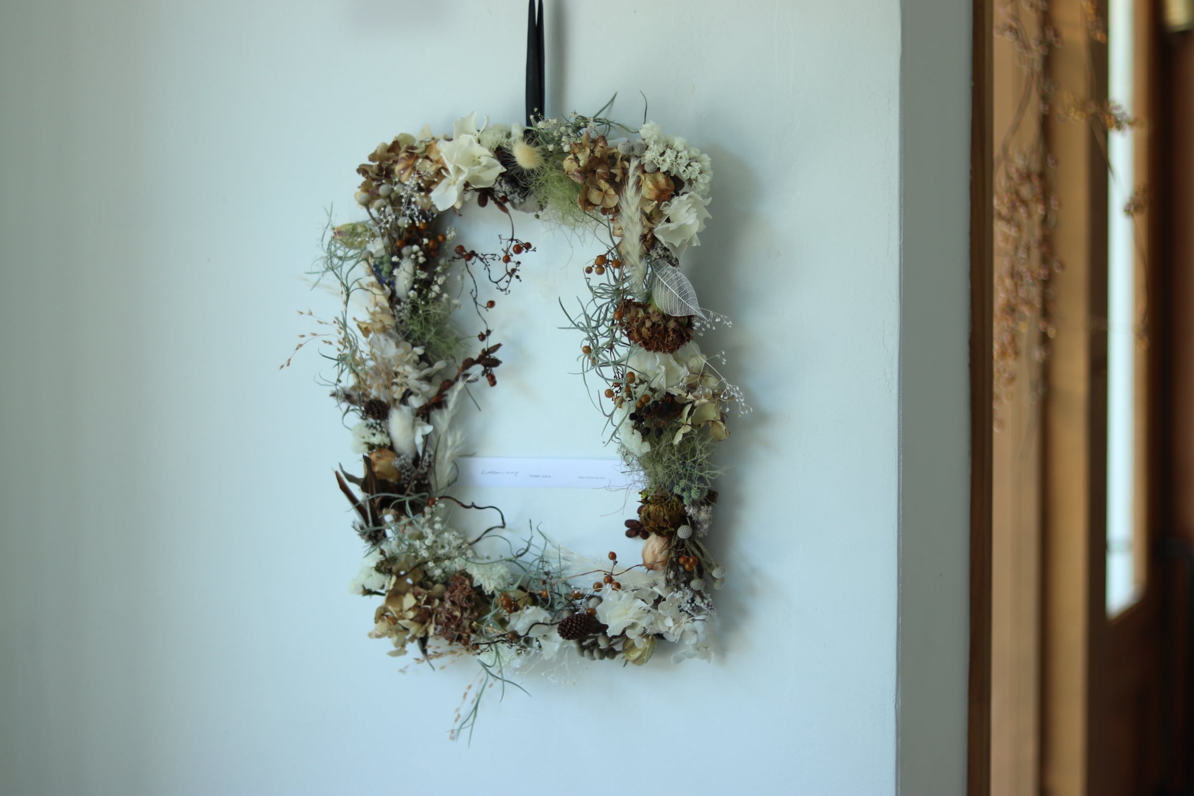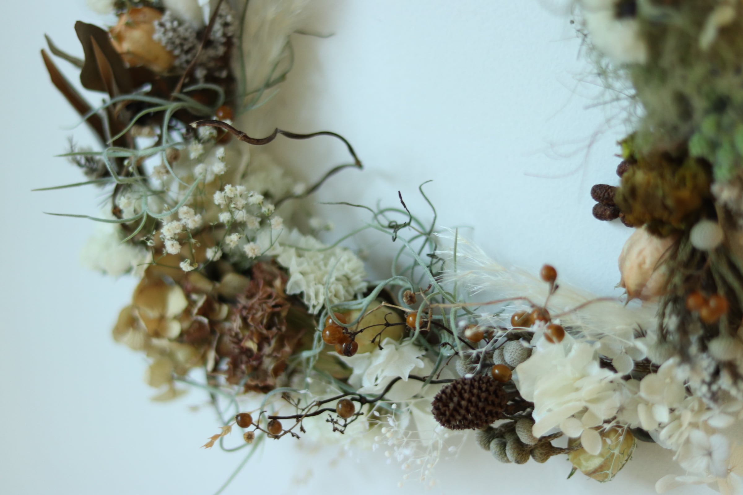 材料: スモークツリー、スターチス、紫陽花、ハイブリッドスターチス、パンパス、エリンジューム、カーネーション、ブルニア、エアプランツ、ヘクソカズラ、他