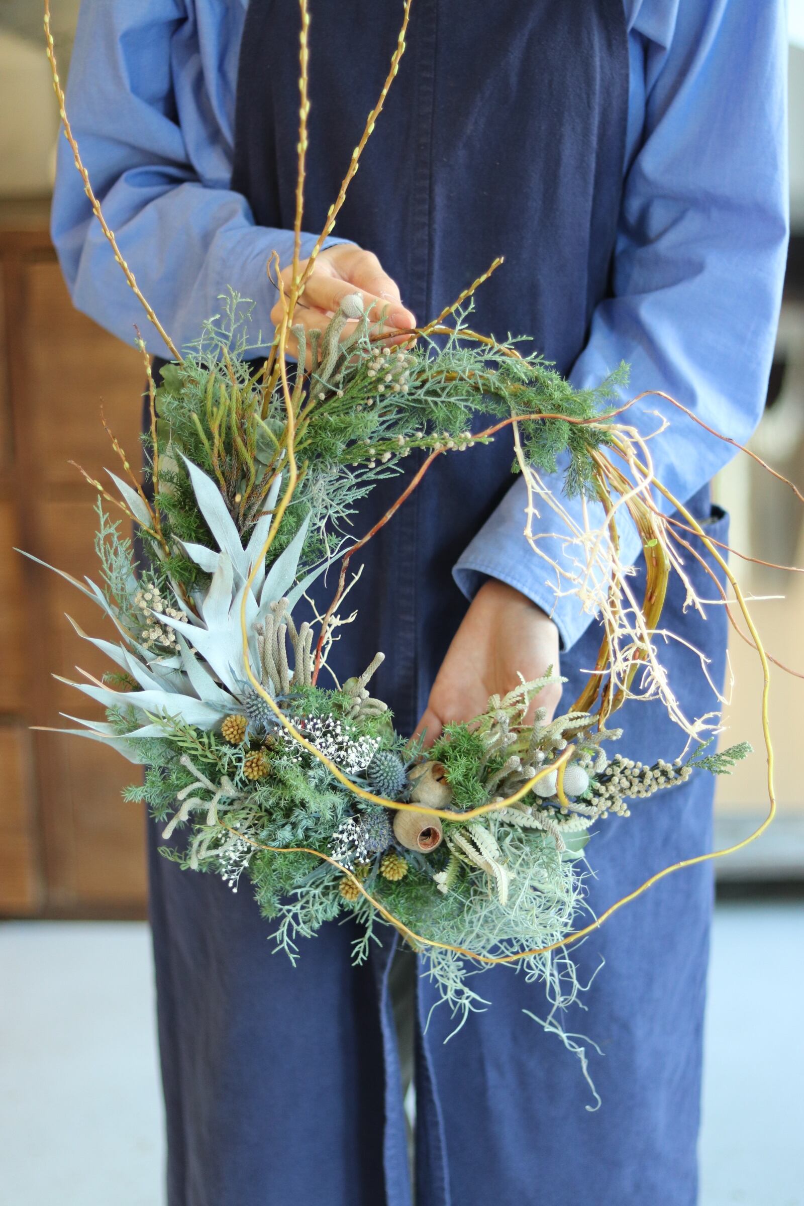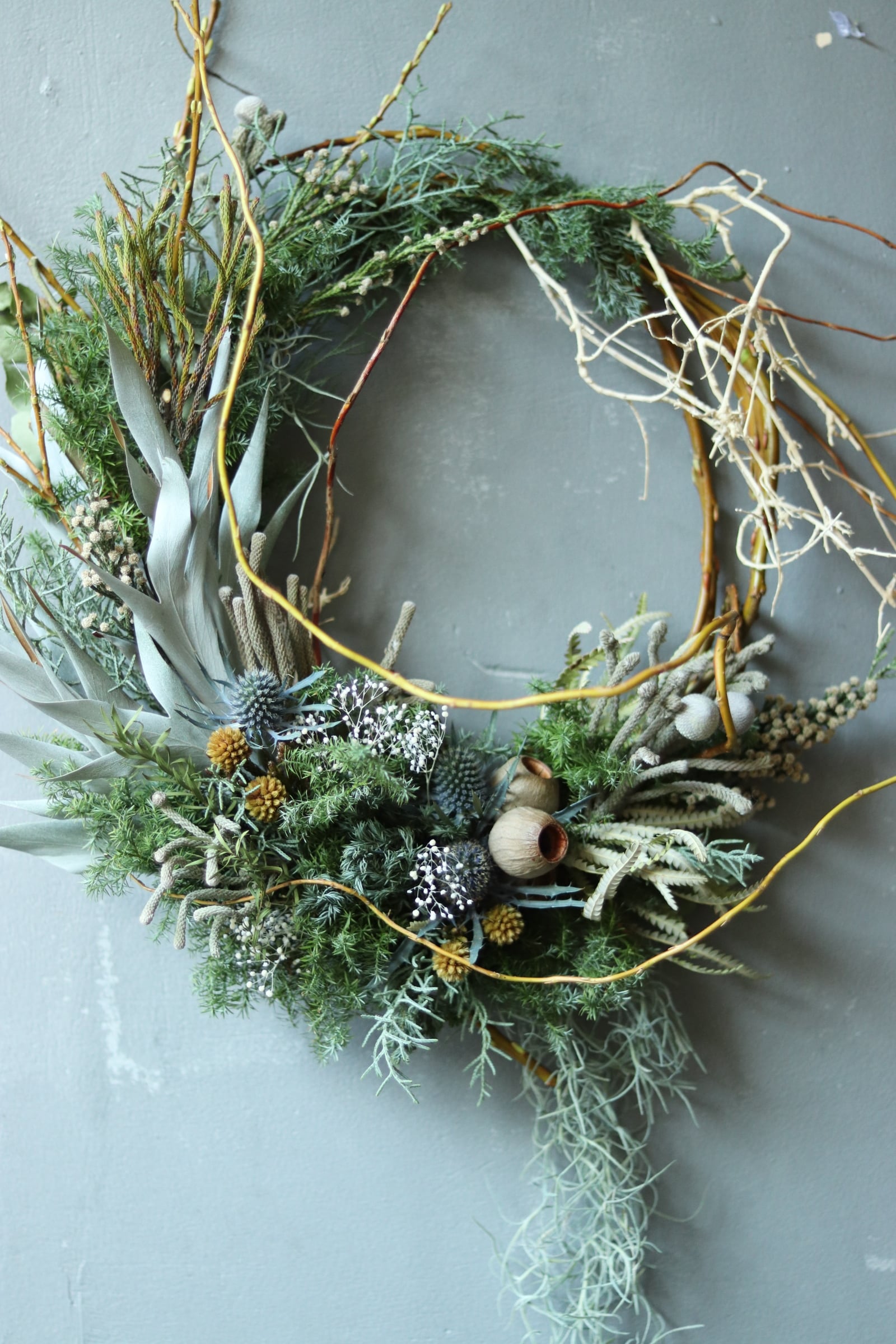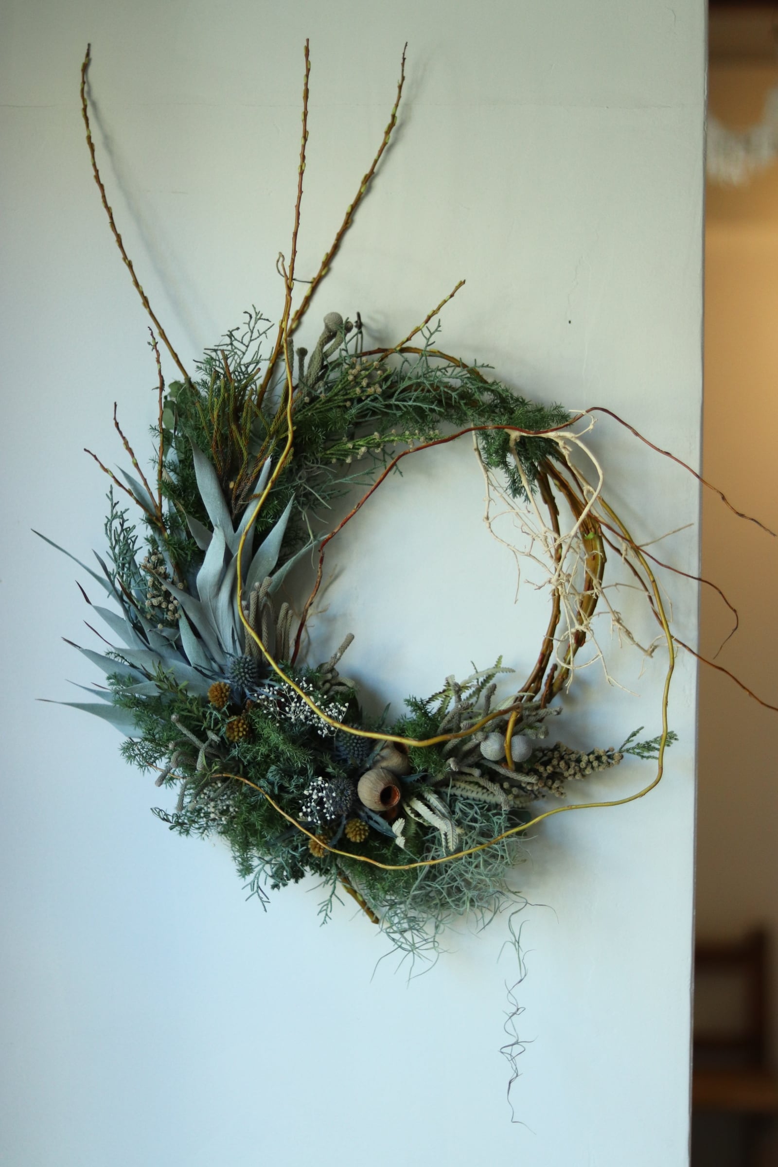 材料: ブルーアイス、ユーカリポポラス、バーゼリア、コニカル、ヒムロスギ、リューカデンドロン、ボンサンウッド、石化柳、グレビレア
