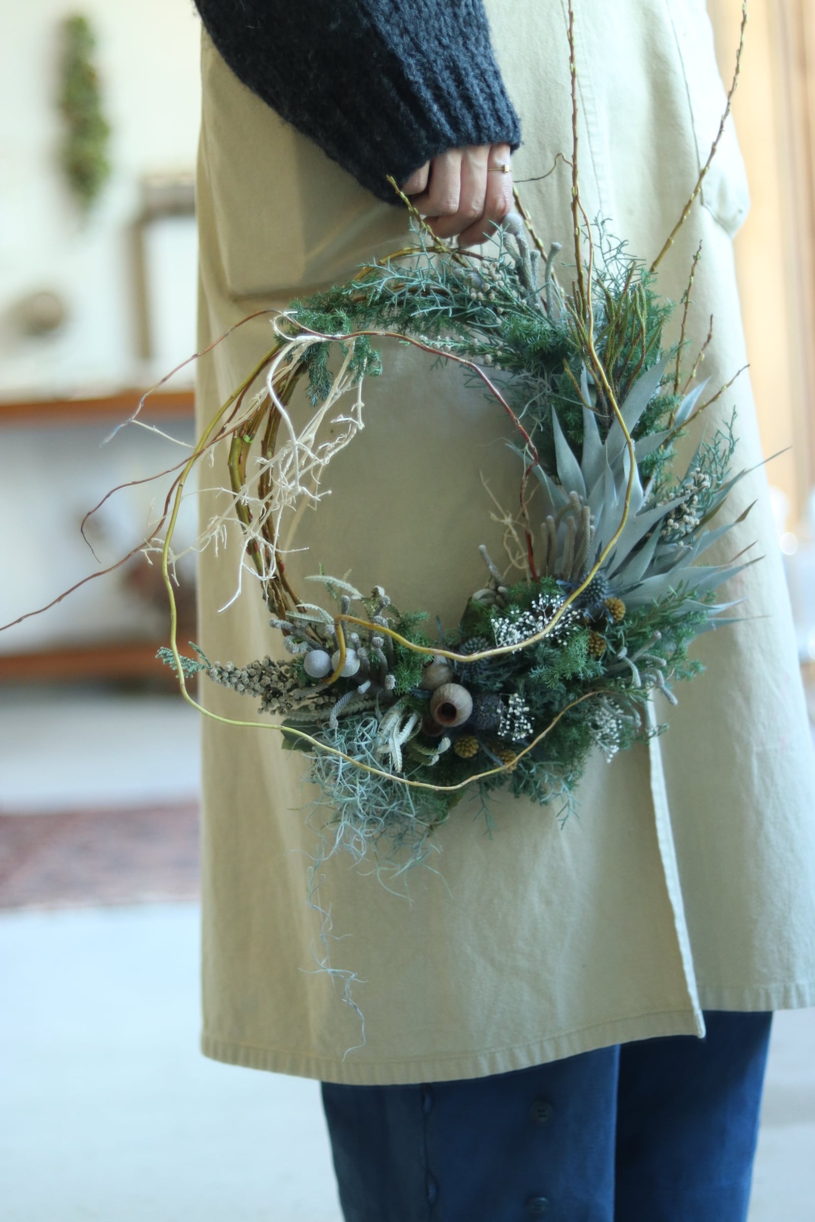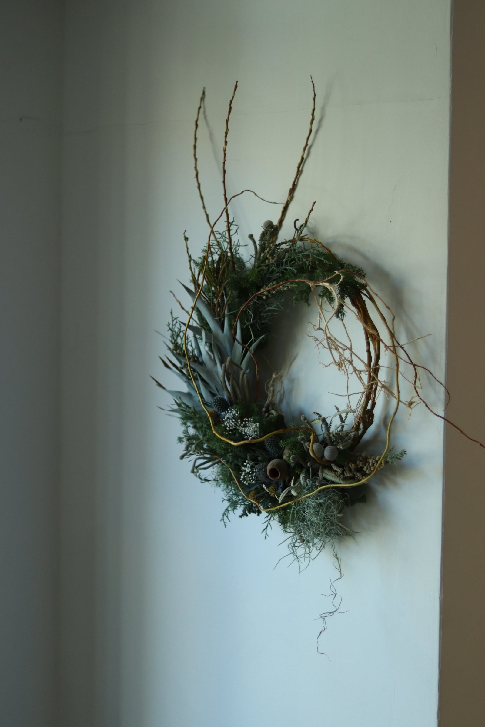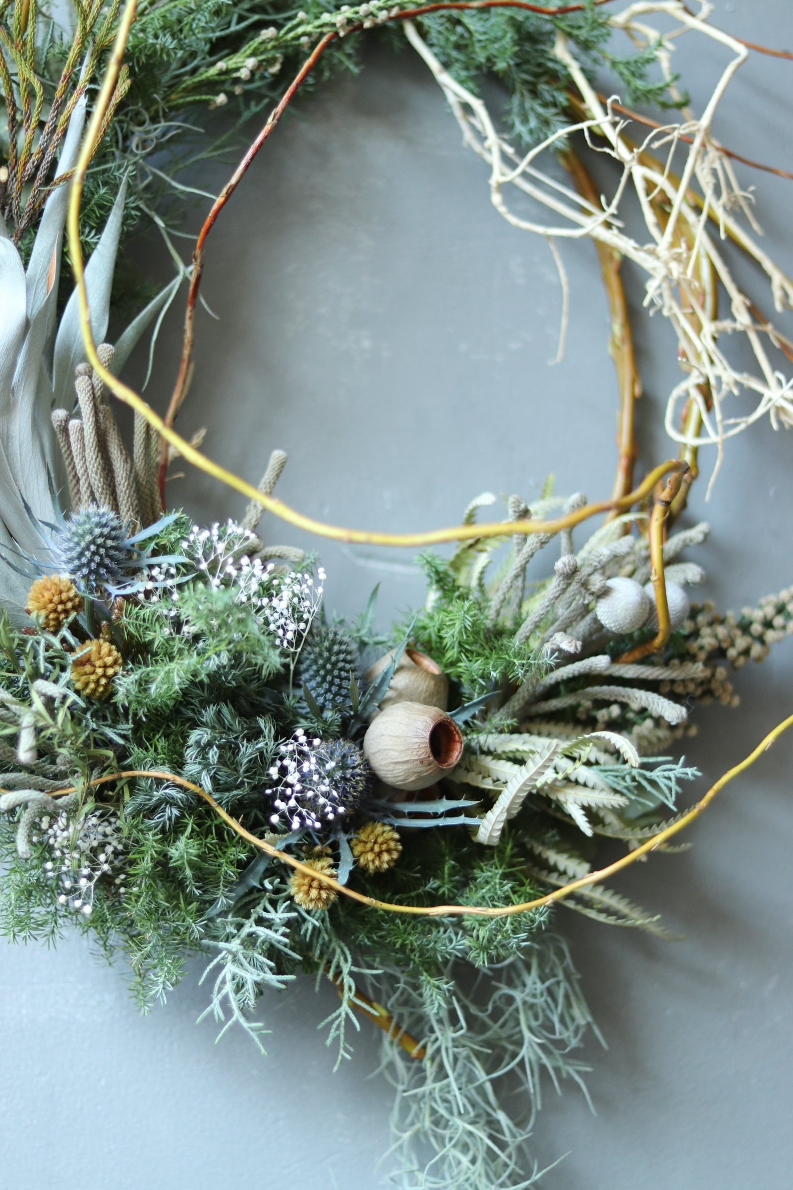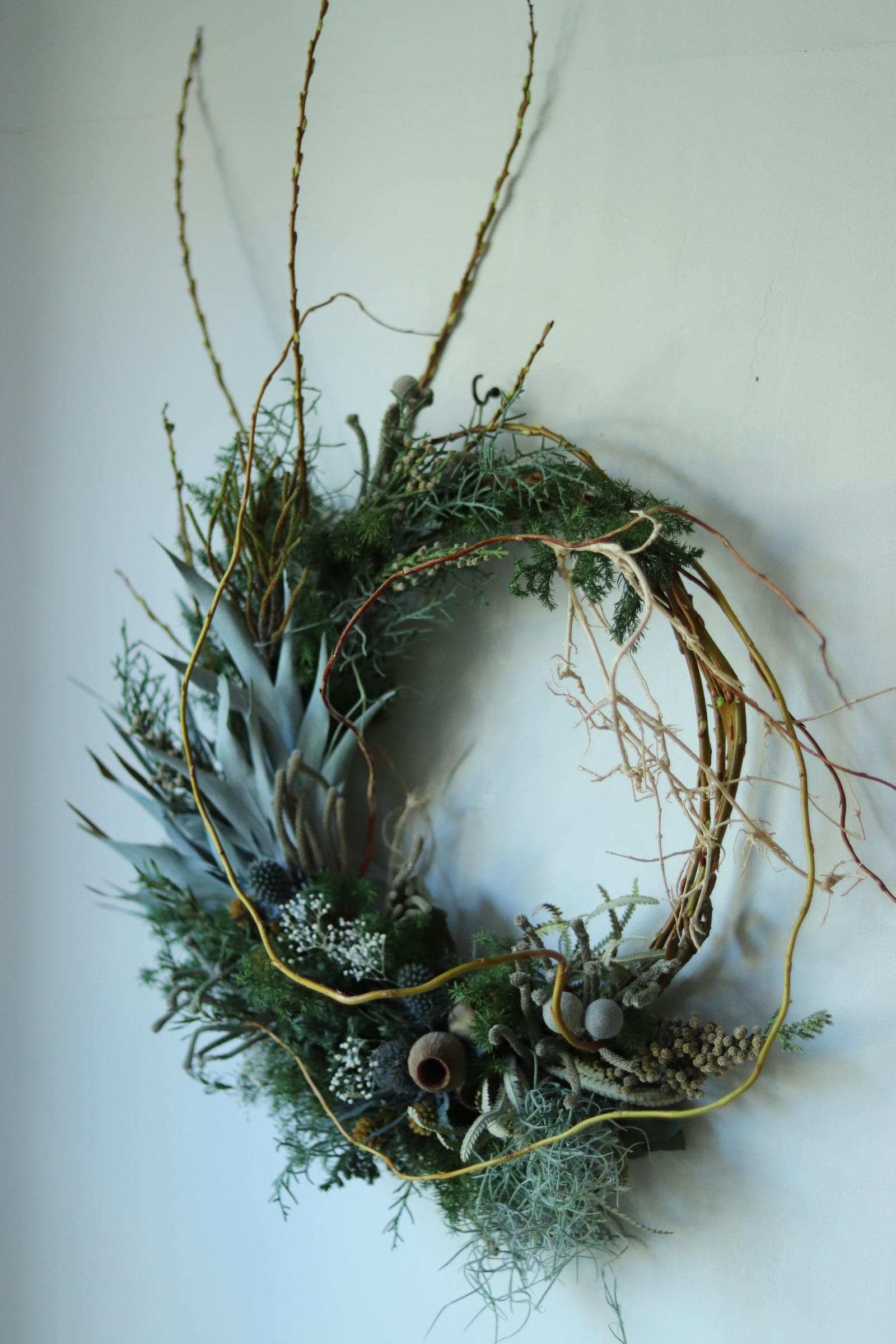 材料: ブルーアイス、ユーカリポポラス、バーゼリア、コニカル、ヒムロスギ、リューカデンドロン、ボンサンウッド、石化柳、グレビレア