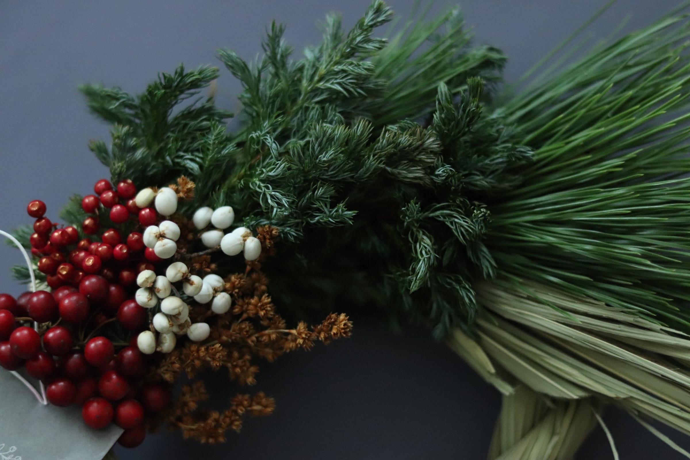 材料: 松、サンキライ、ペッパーベリー、ブルーバード、パルミエットプレイ