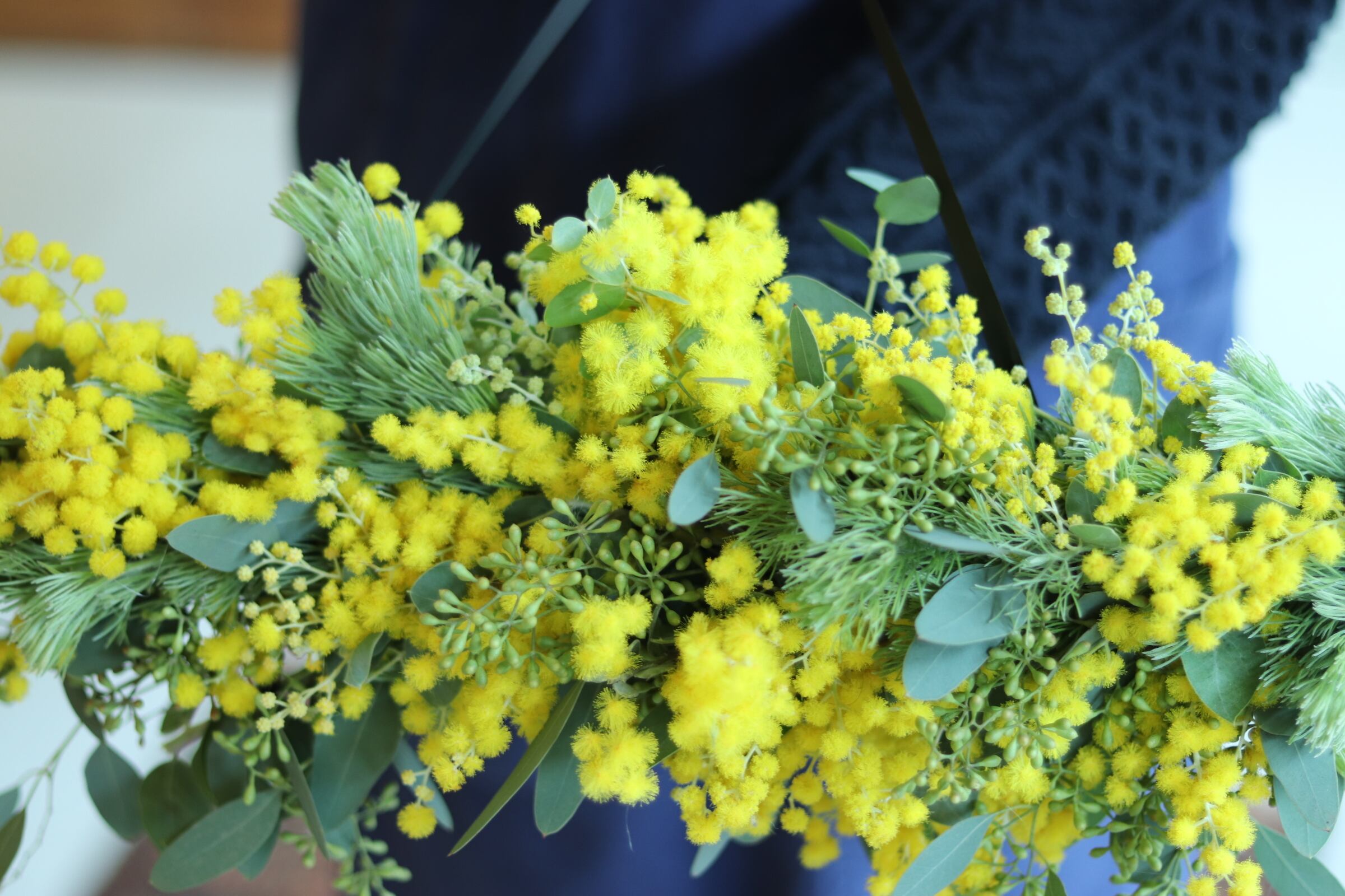 材料はミモザがメインに、ウーリーブッシュやポポラスベリーも加えています。