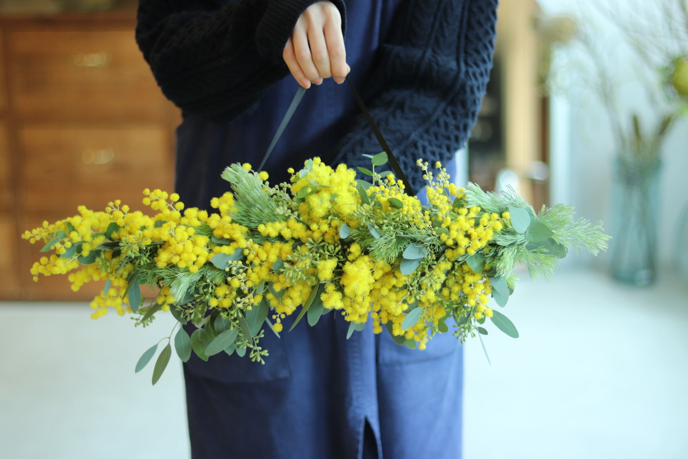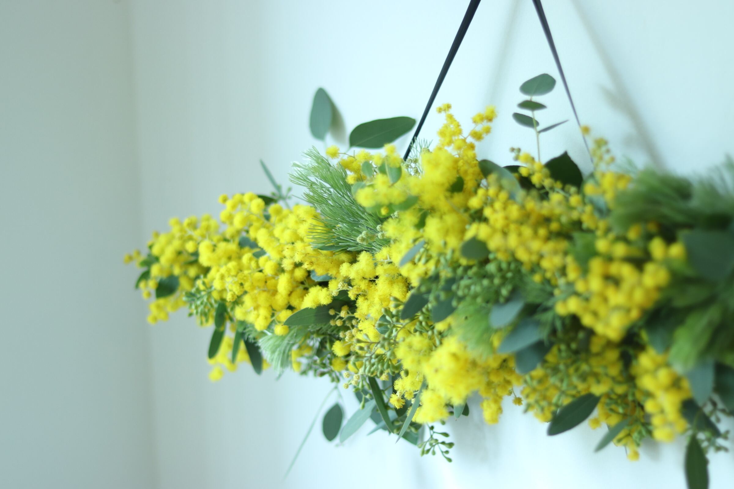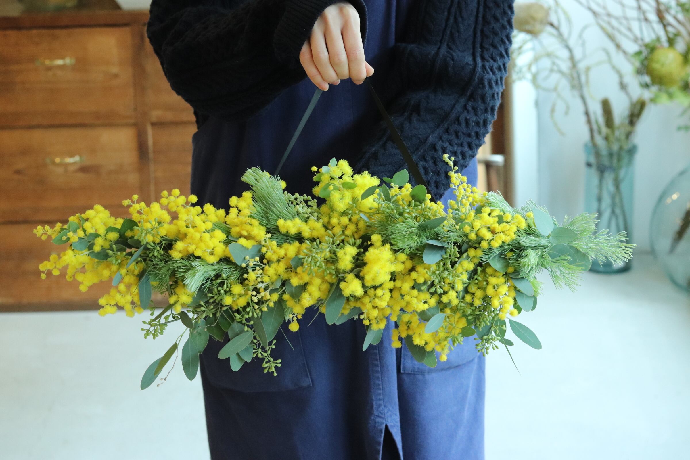 たっぷりのミモザを使った、セミドライのスワッグです。