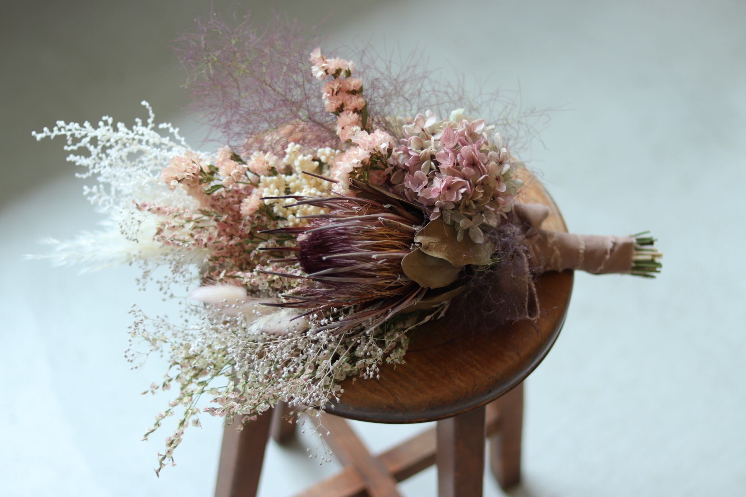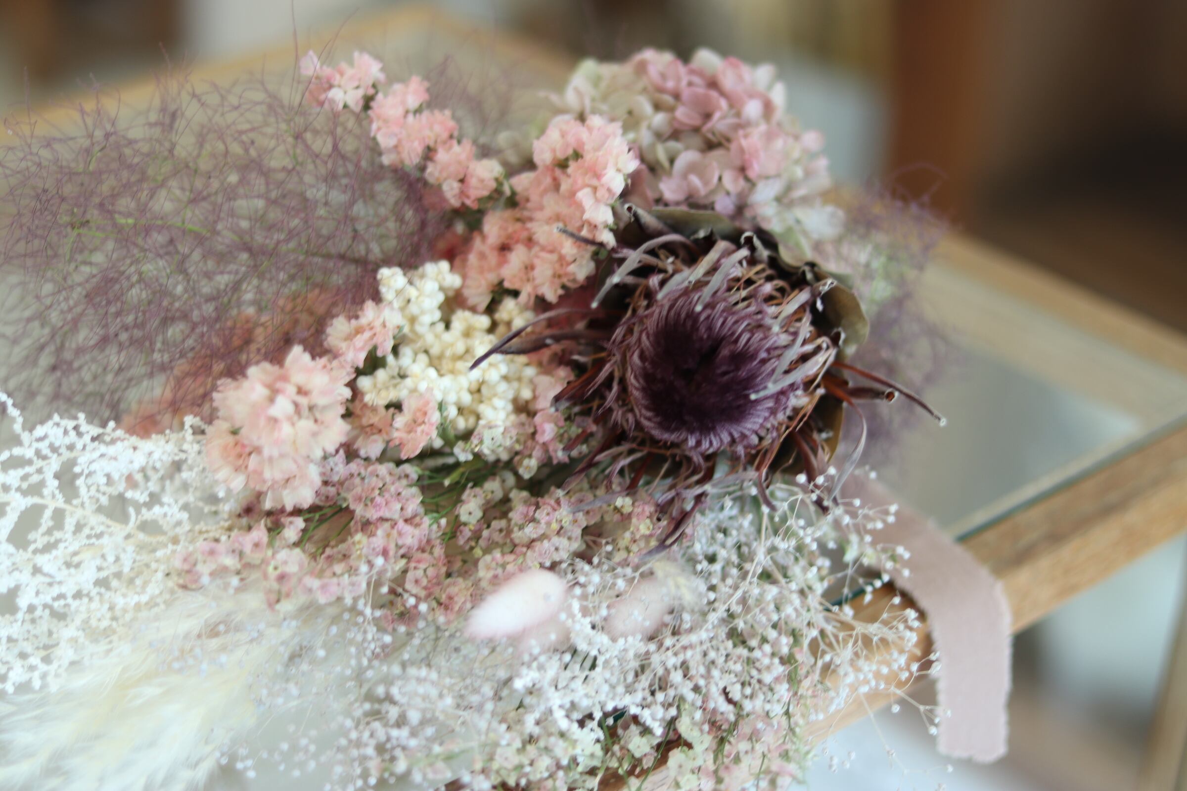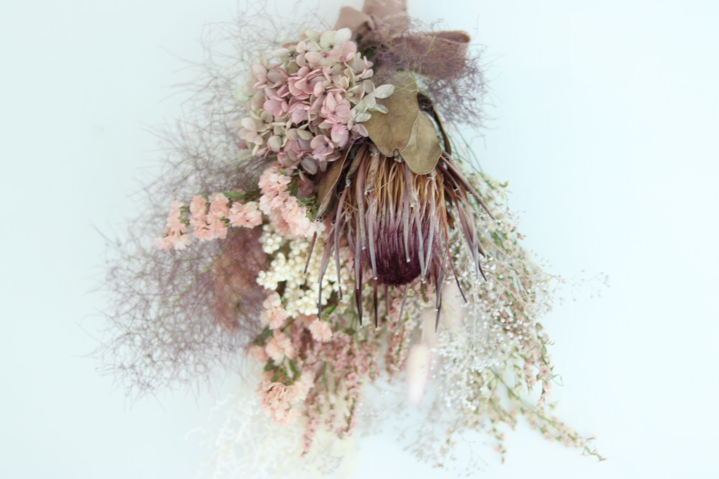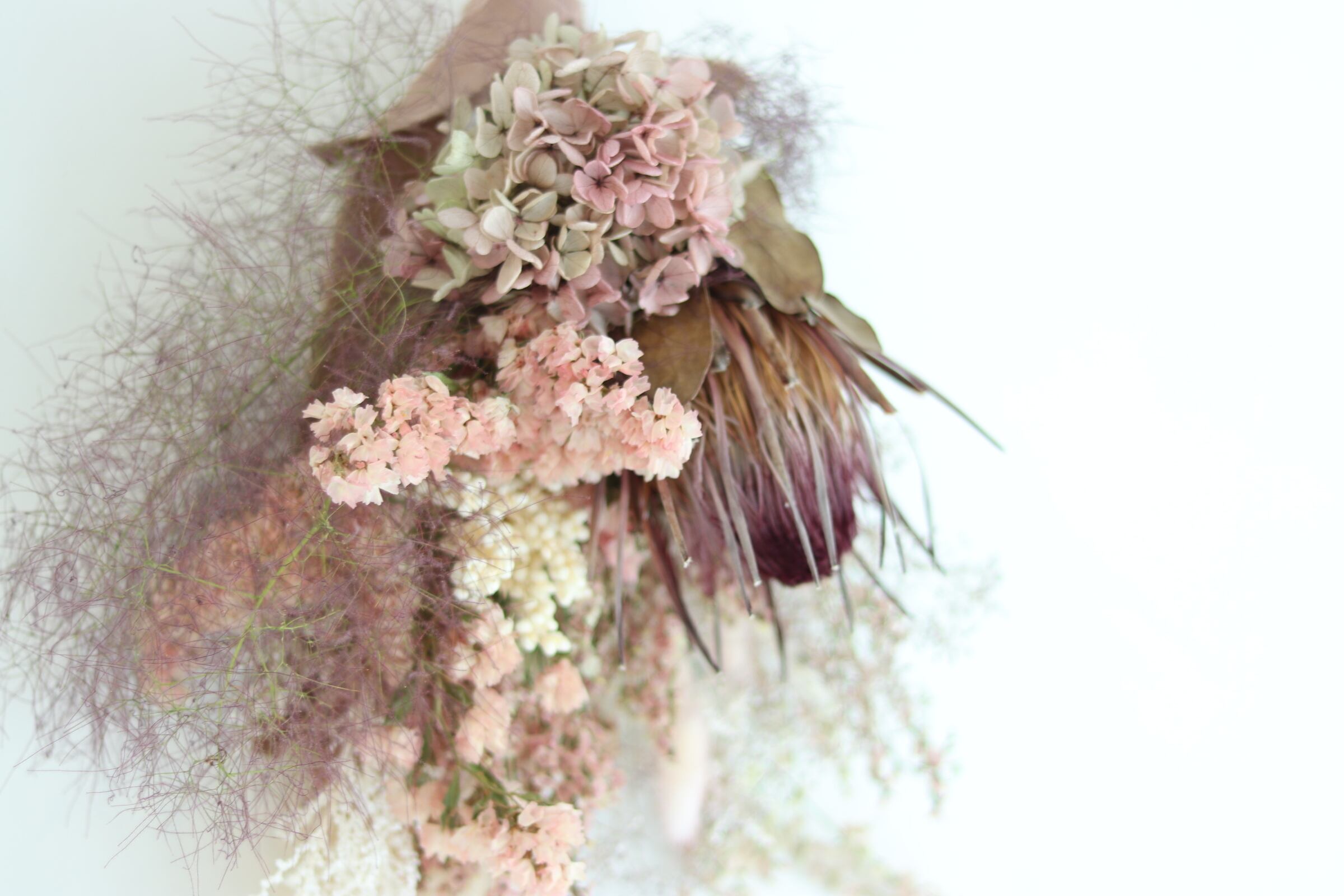 材料: スターチス、アジサイ、カスミソウ、プロテア、スモークツリー、他