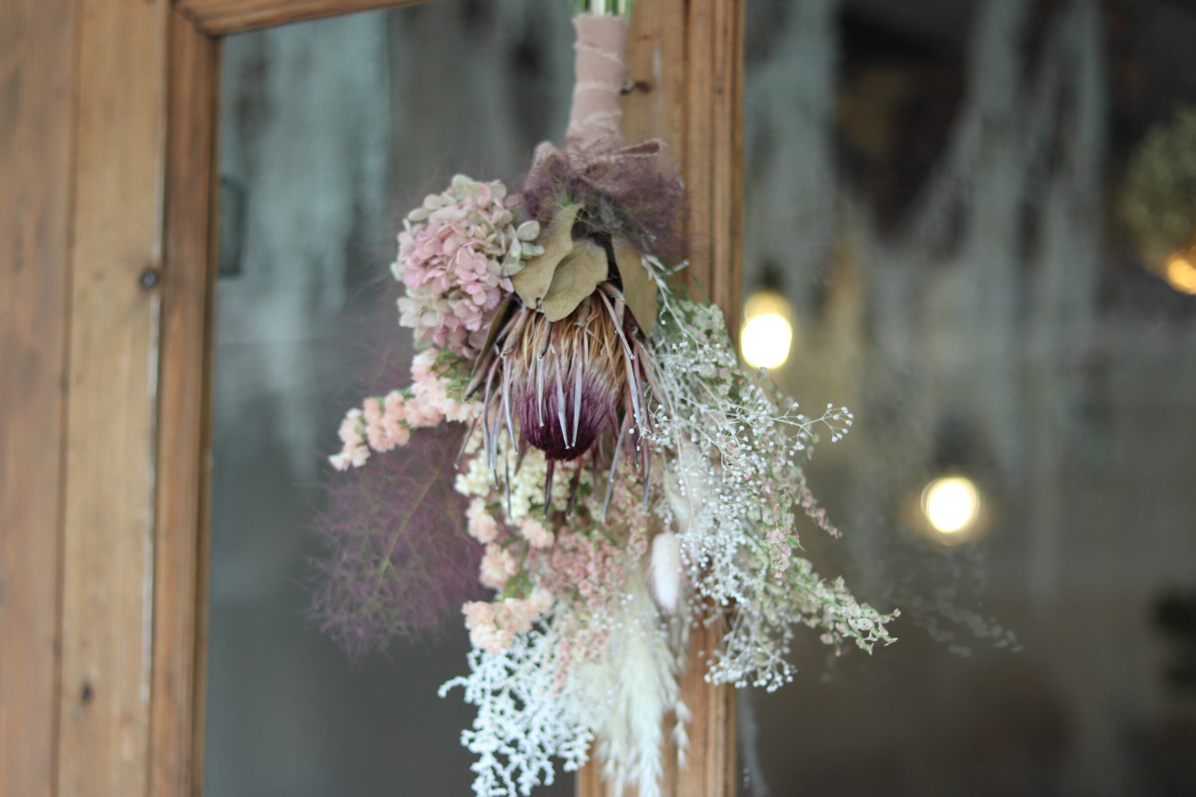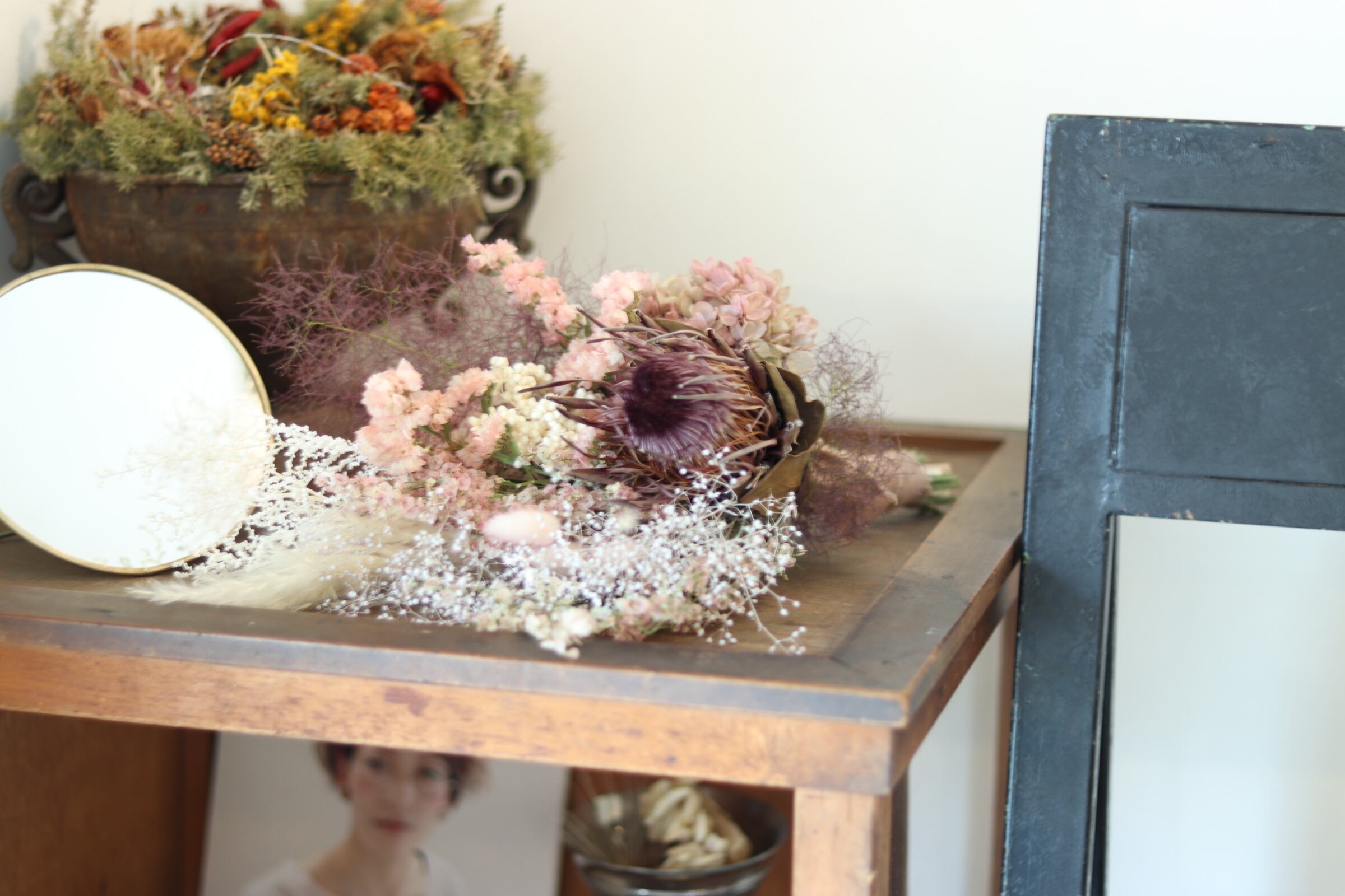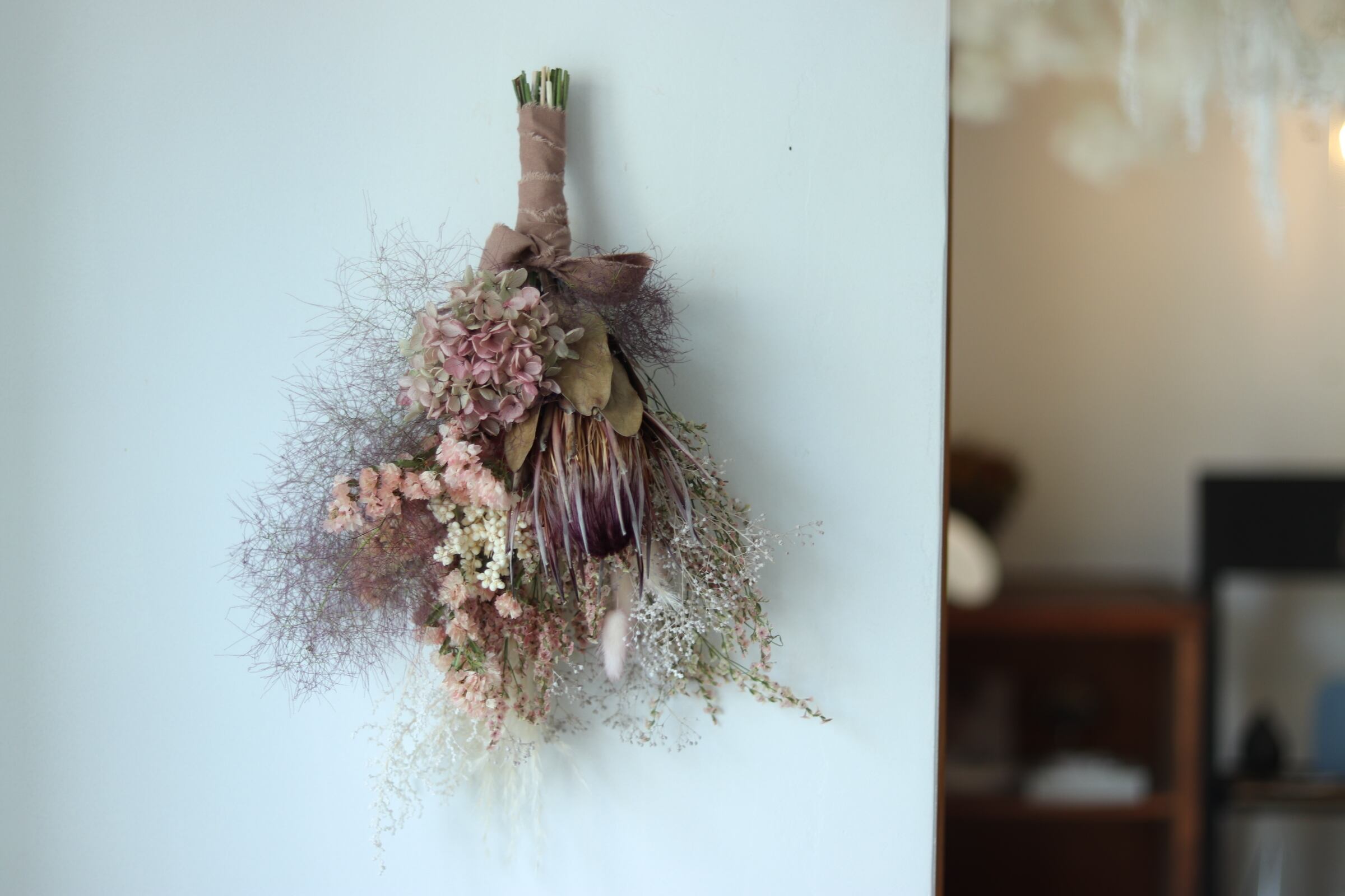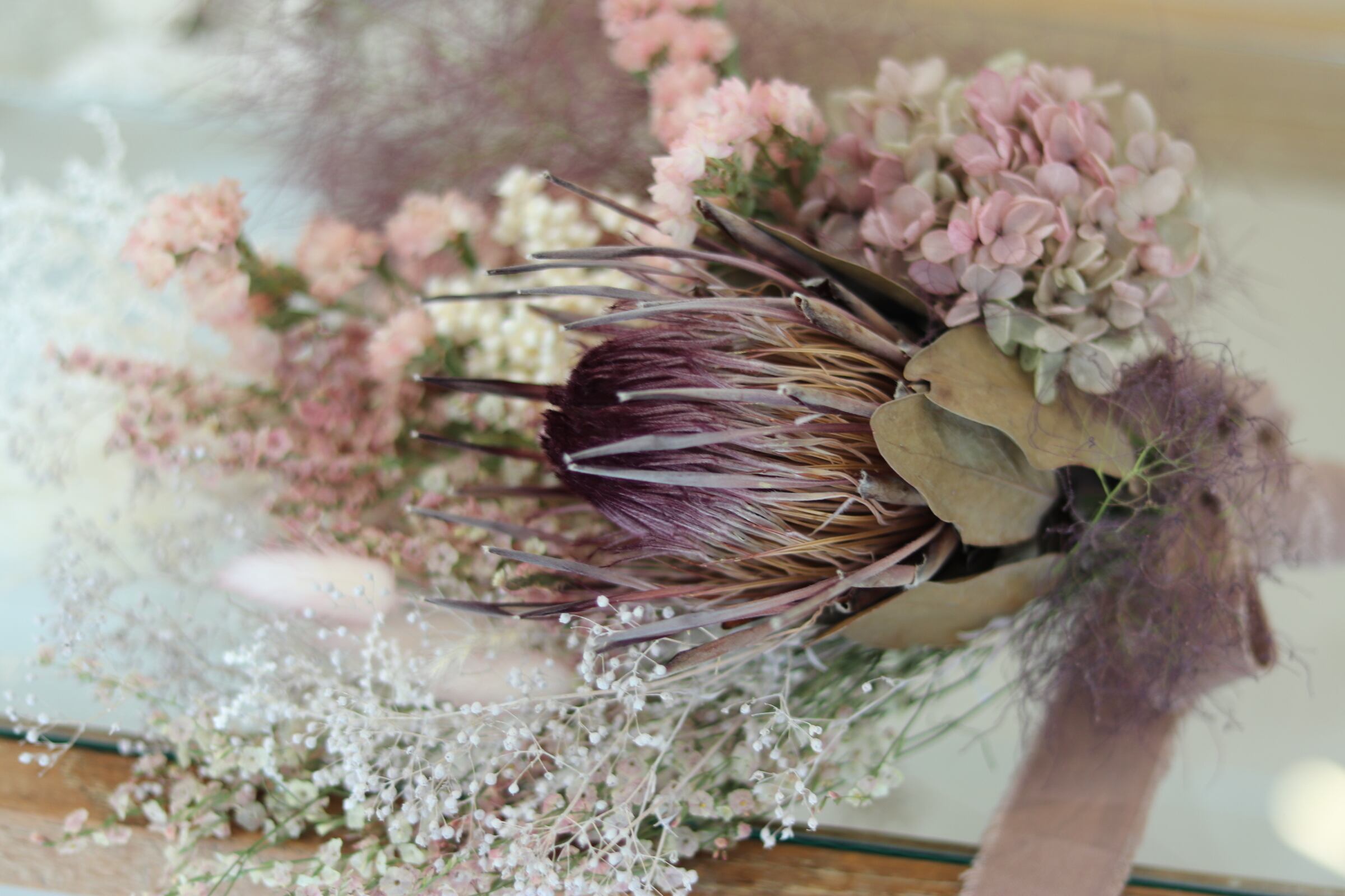 材料: スターチス、アジサイ、カスミソウ、プロテア、スモークツリー、他