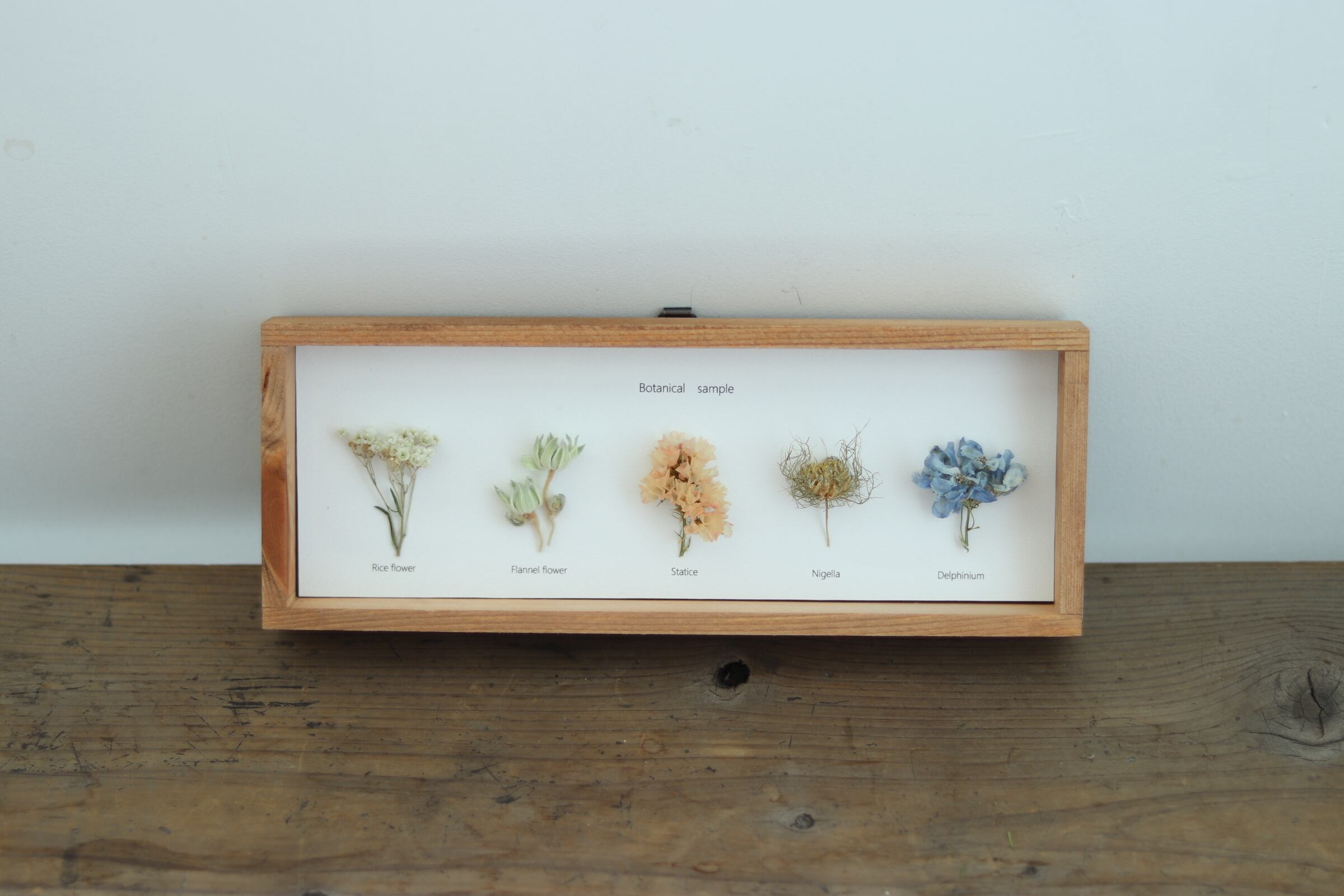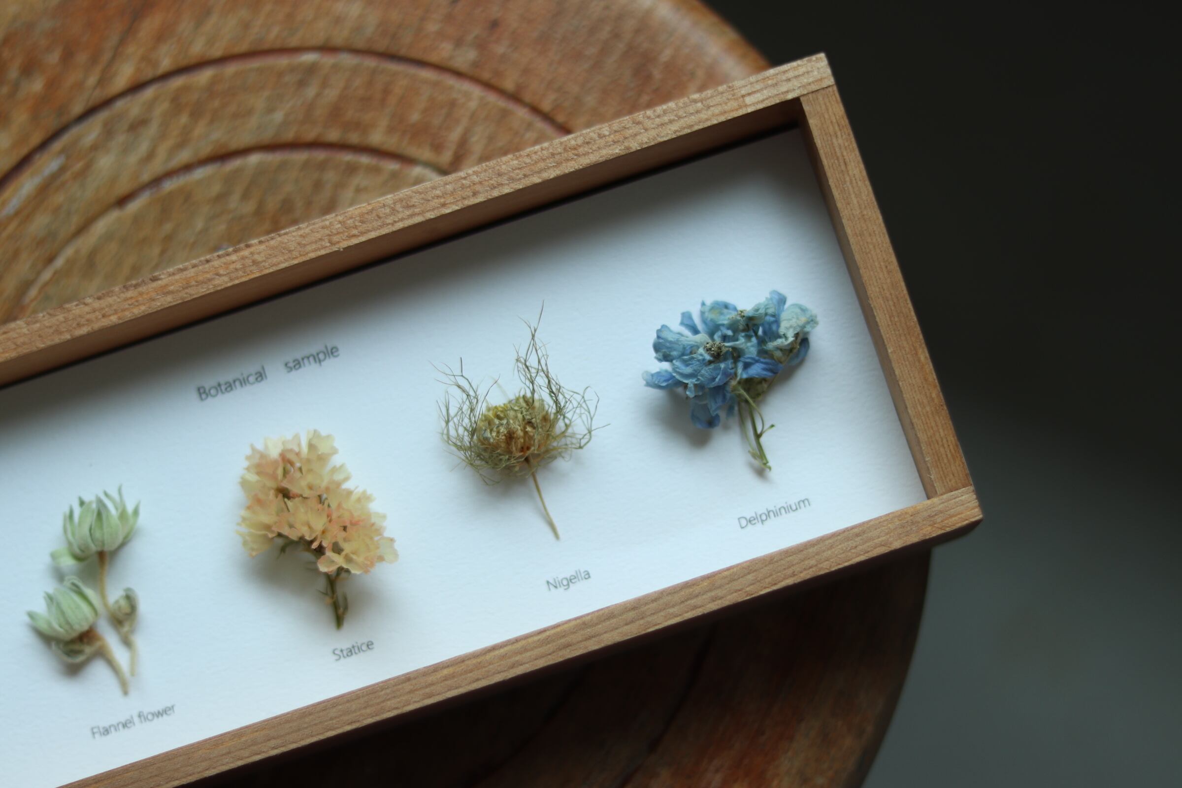 材料: ライスフラワー、フランネルフラワー、スターチス、ニゲラ、デルフィニウム