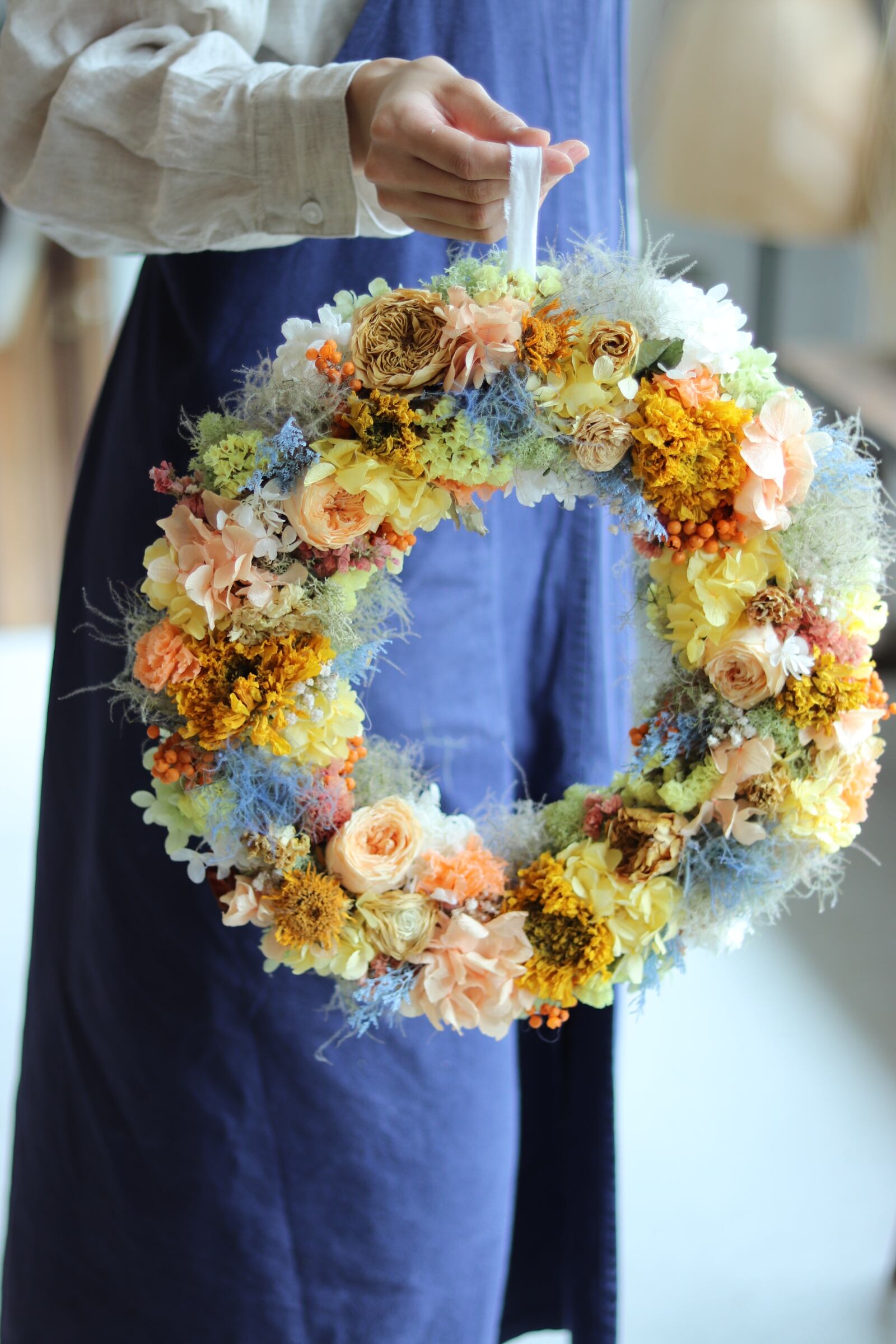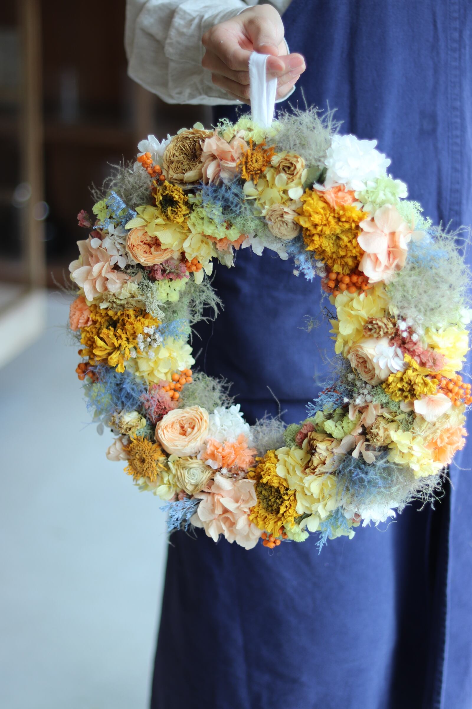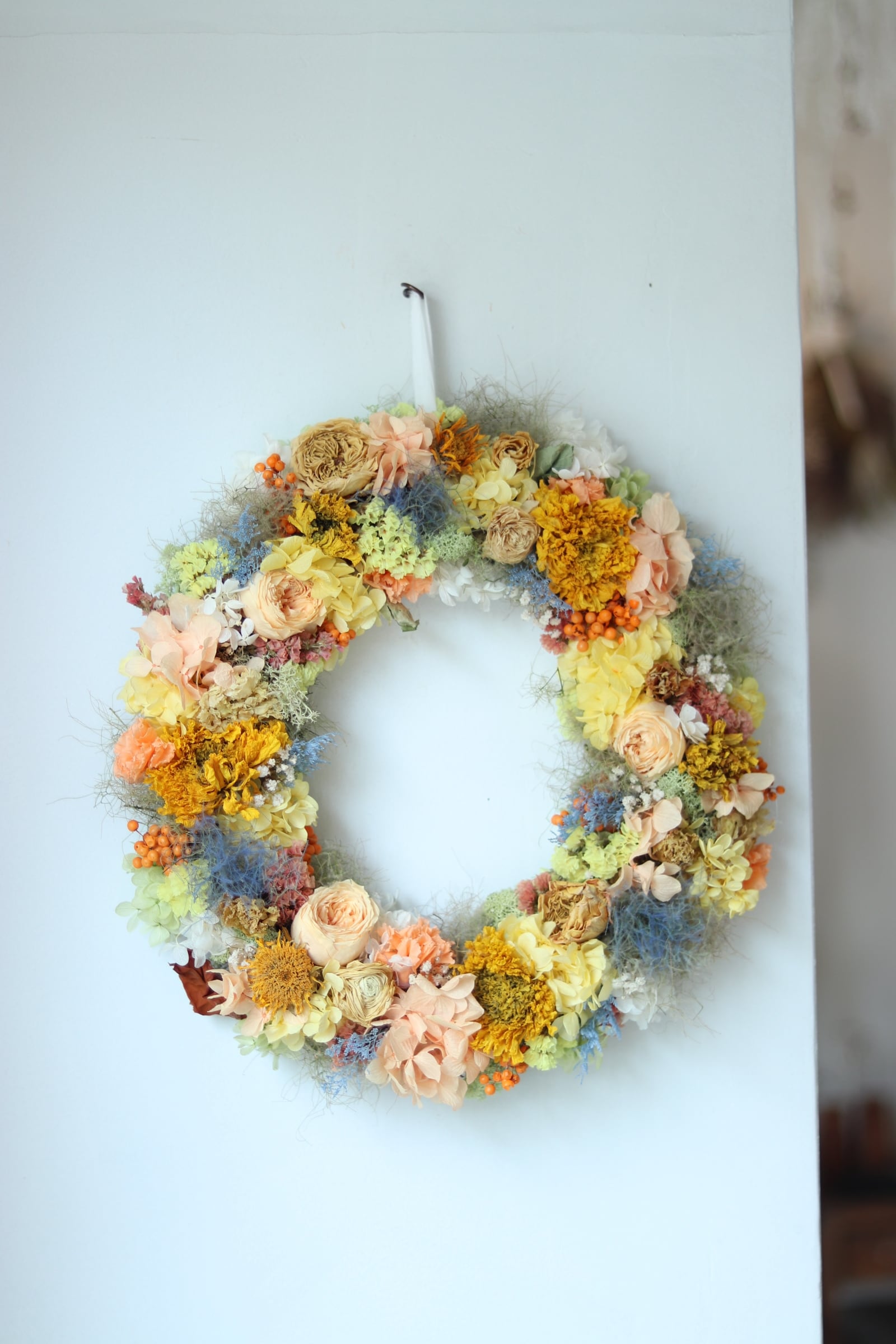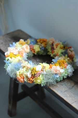 オレンジイエローを基調とし、差し色にブルーを入れたリースをプリザーブドフラワーとドライフラワーで作りました。