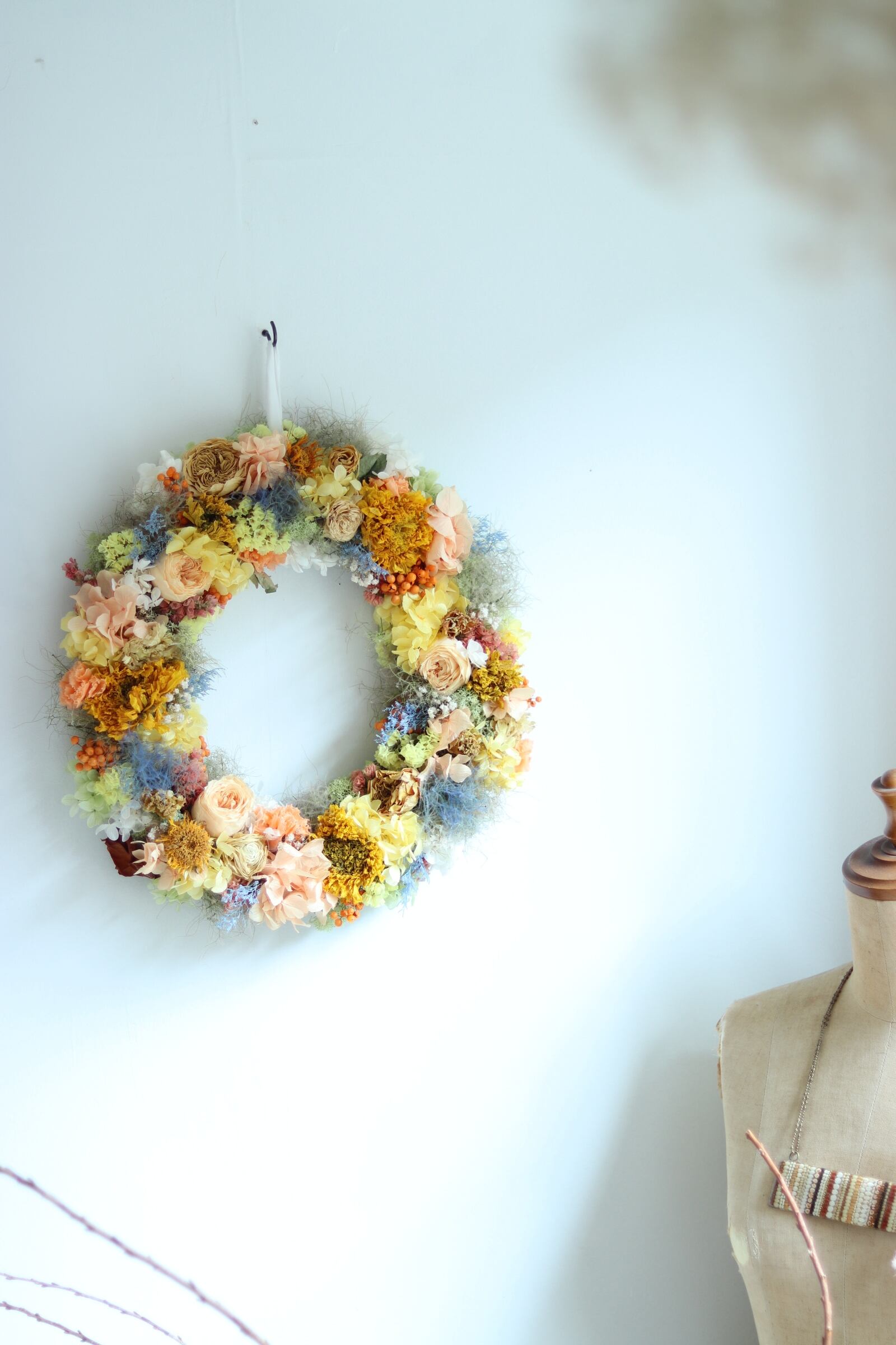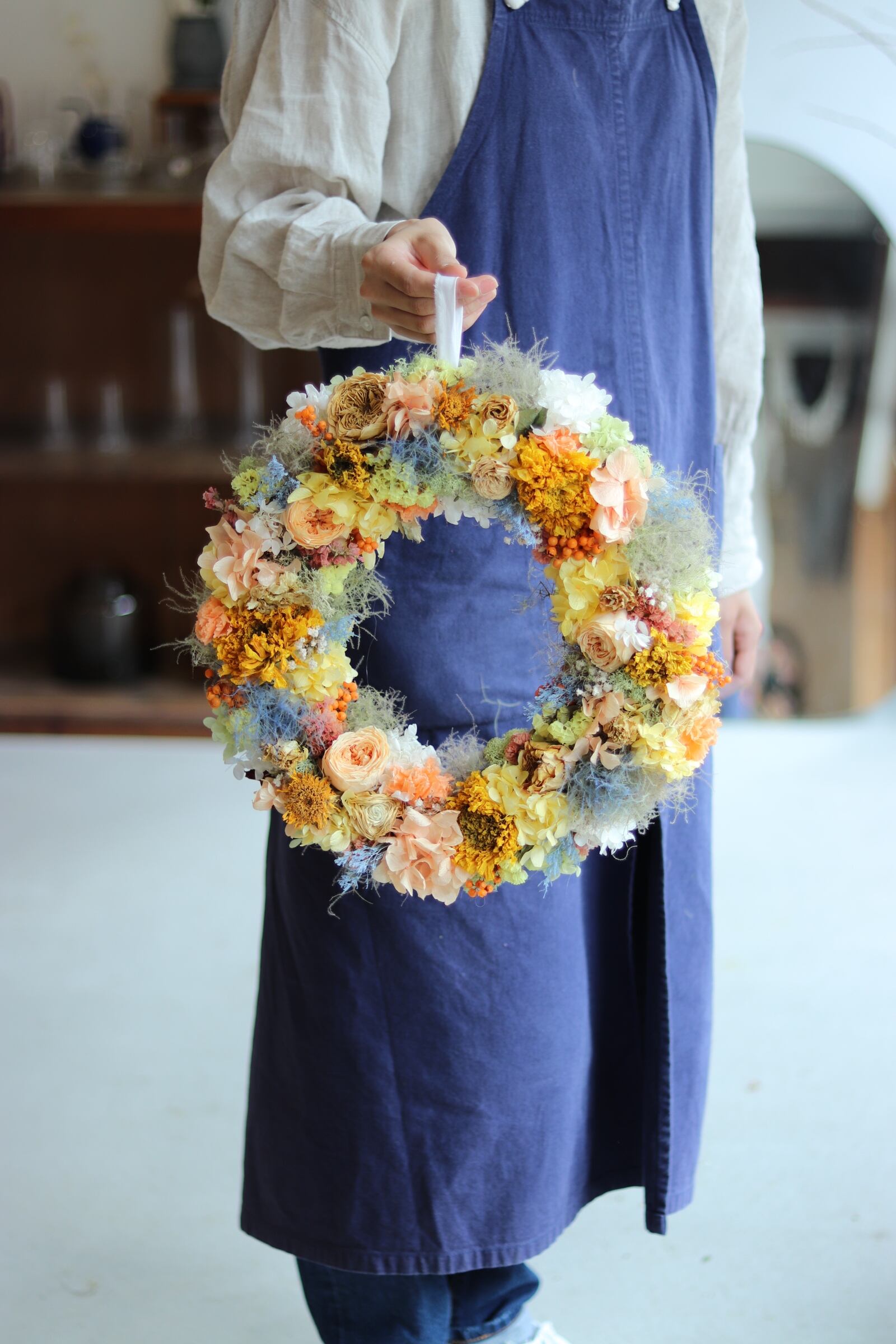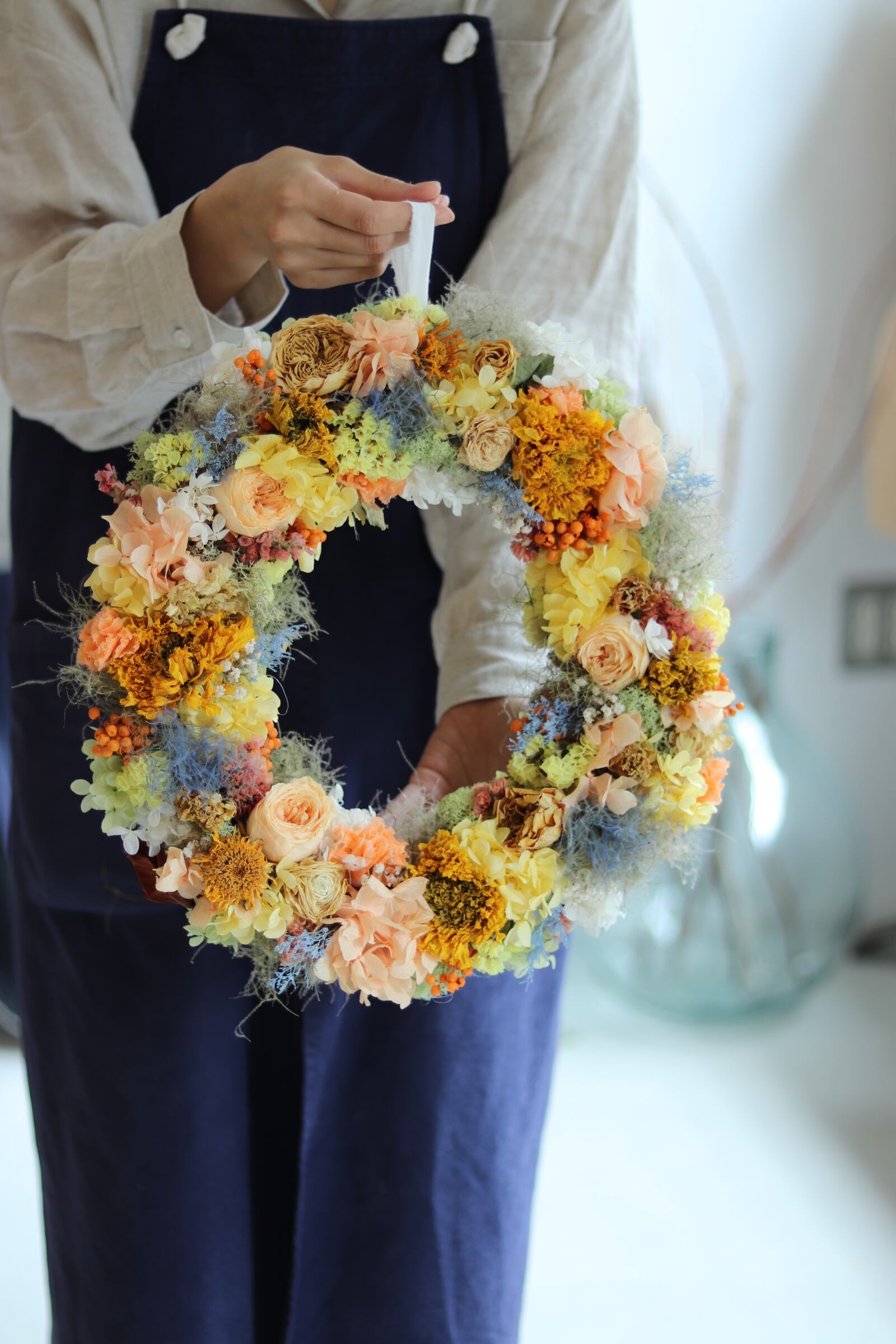 オレンジイエローを基調とし、差し色にブルーを入れたリースをプリザーブドフラワーとドライフラワーで作りました。