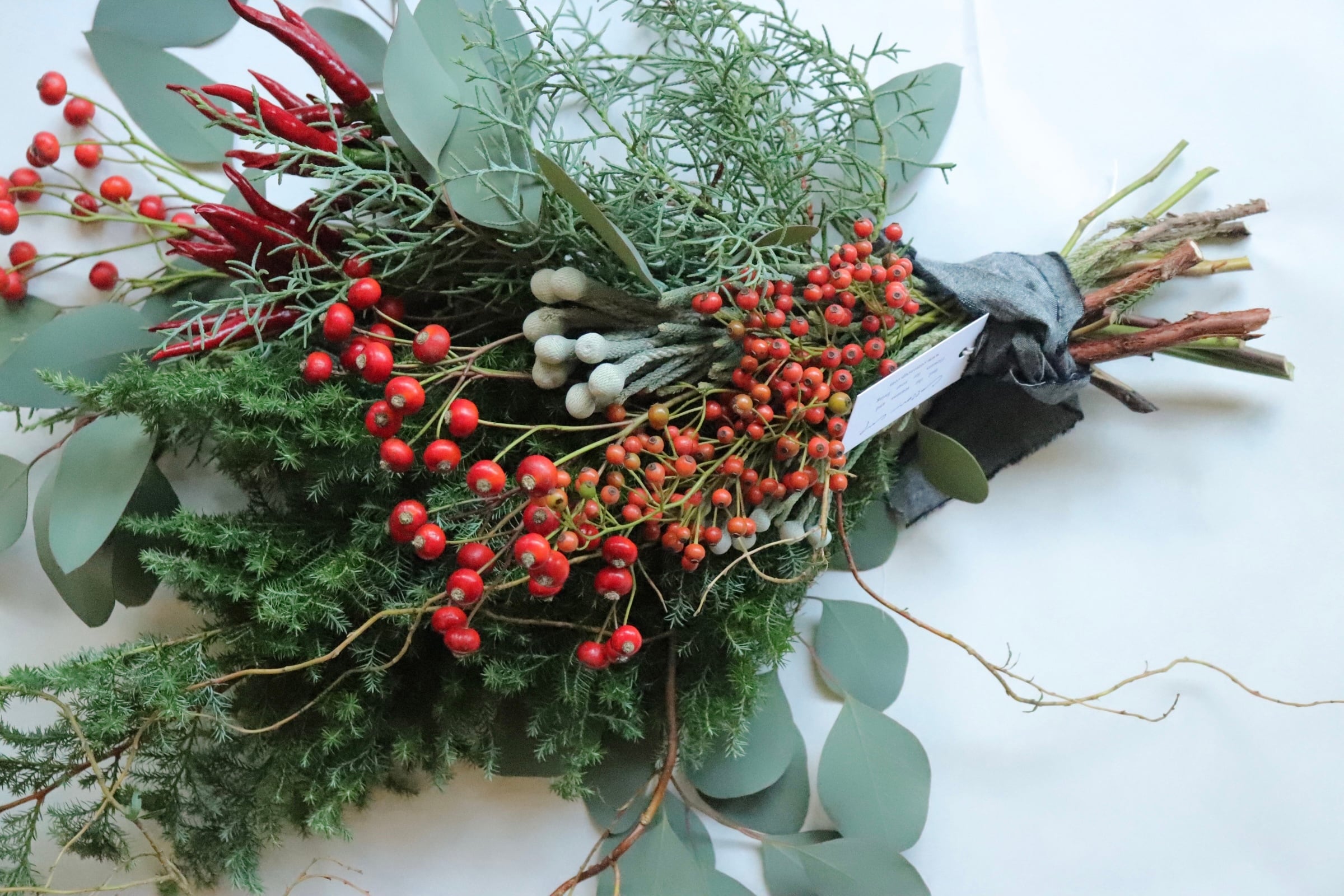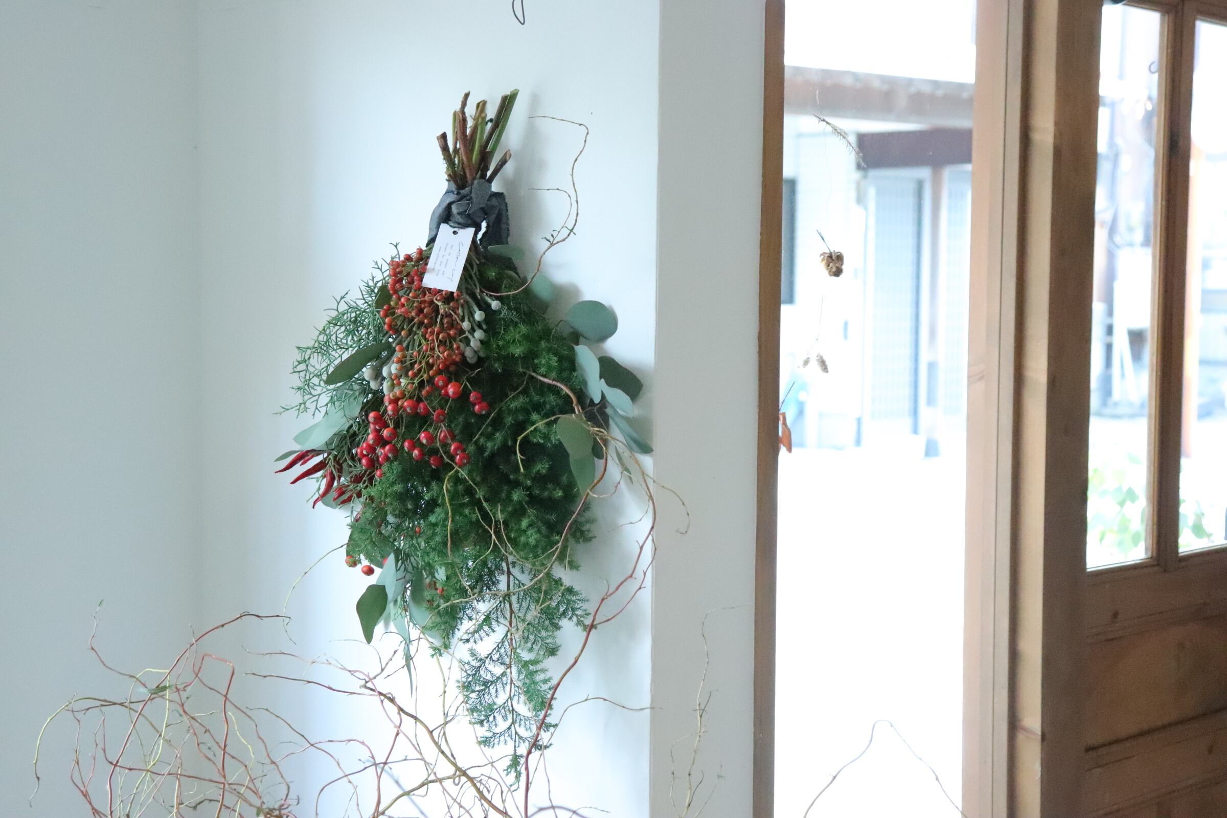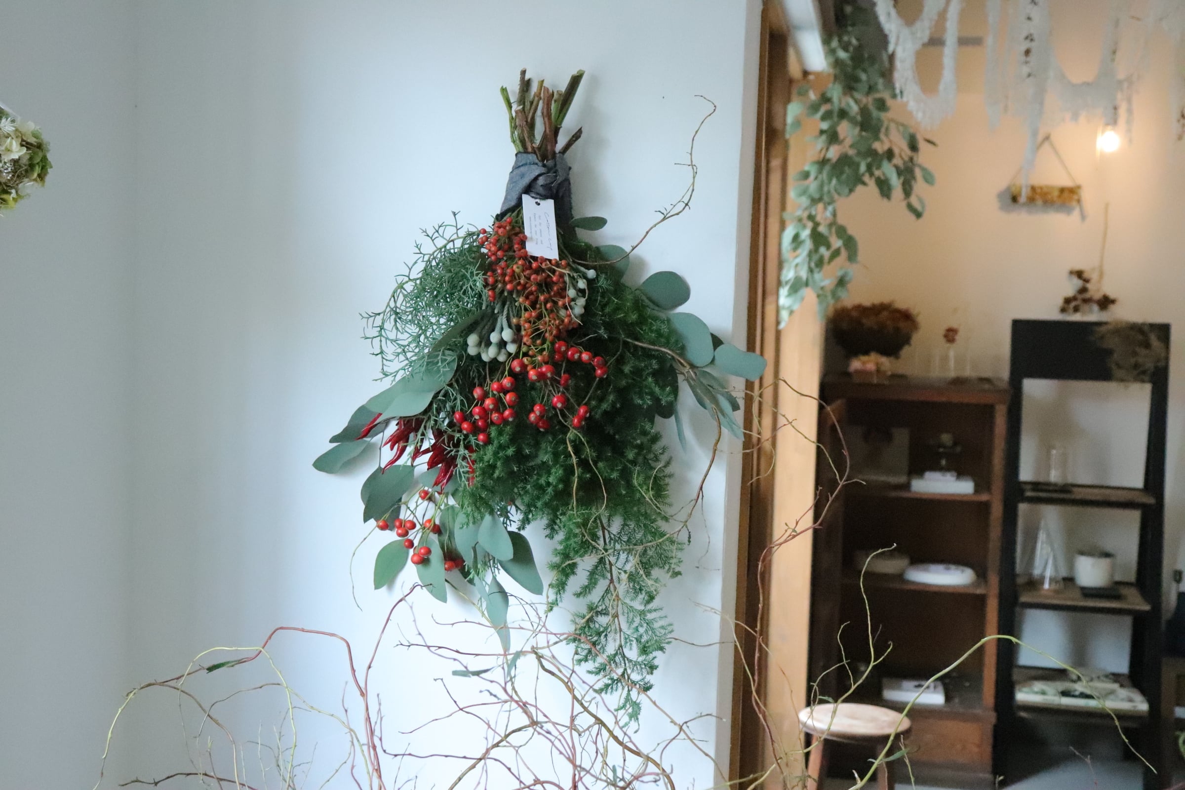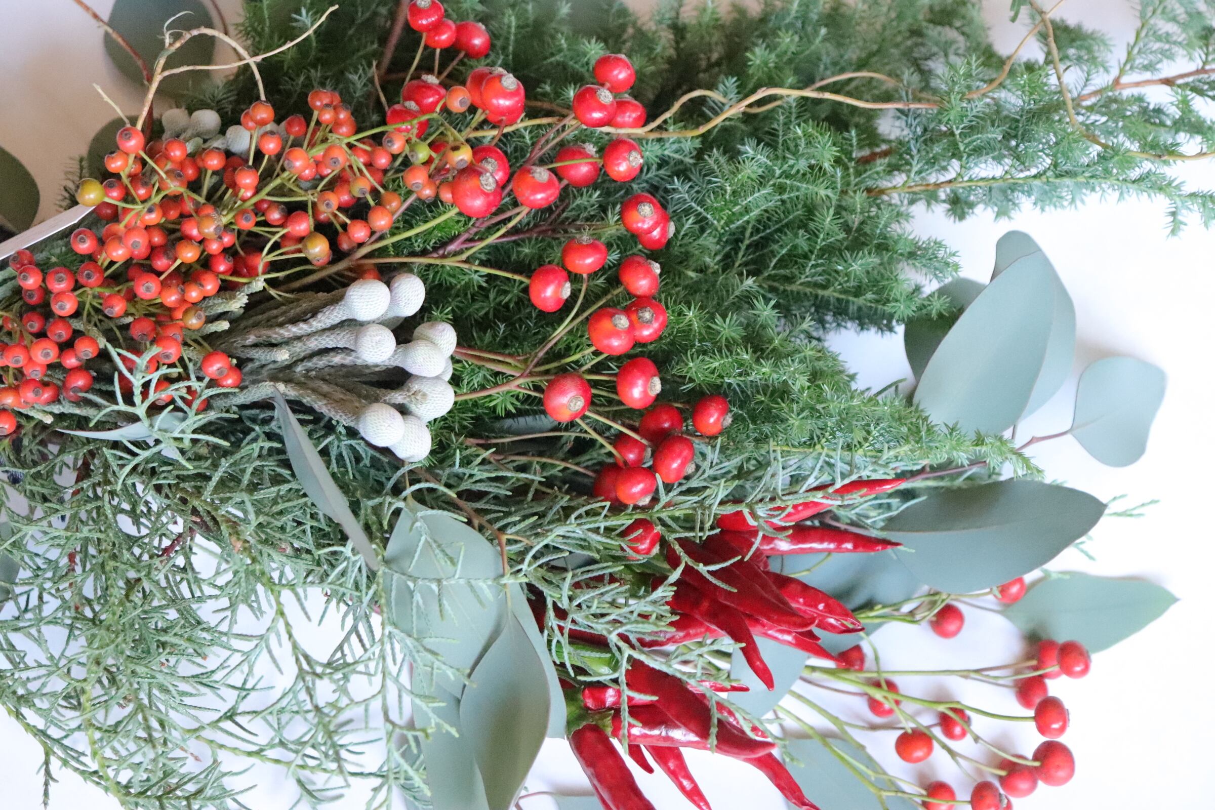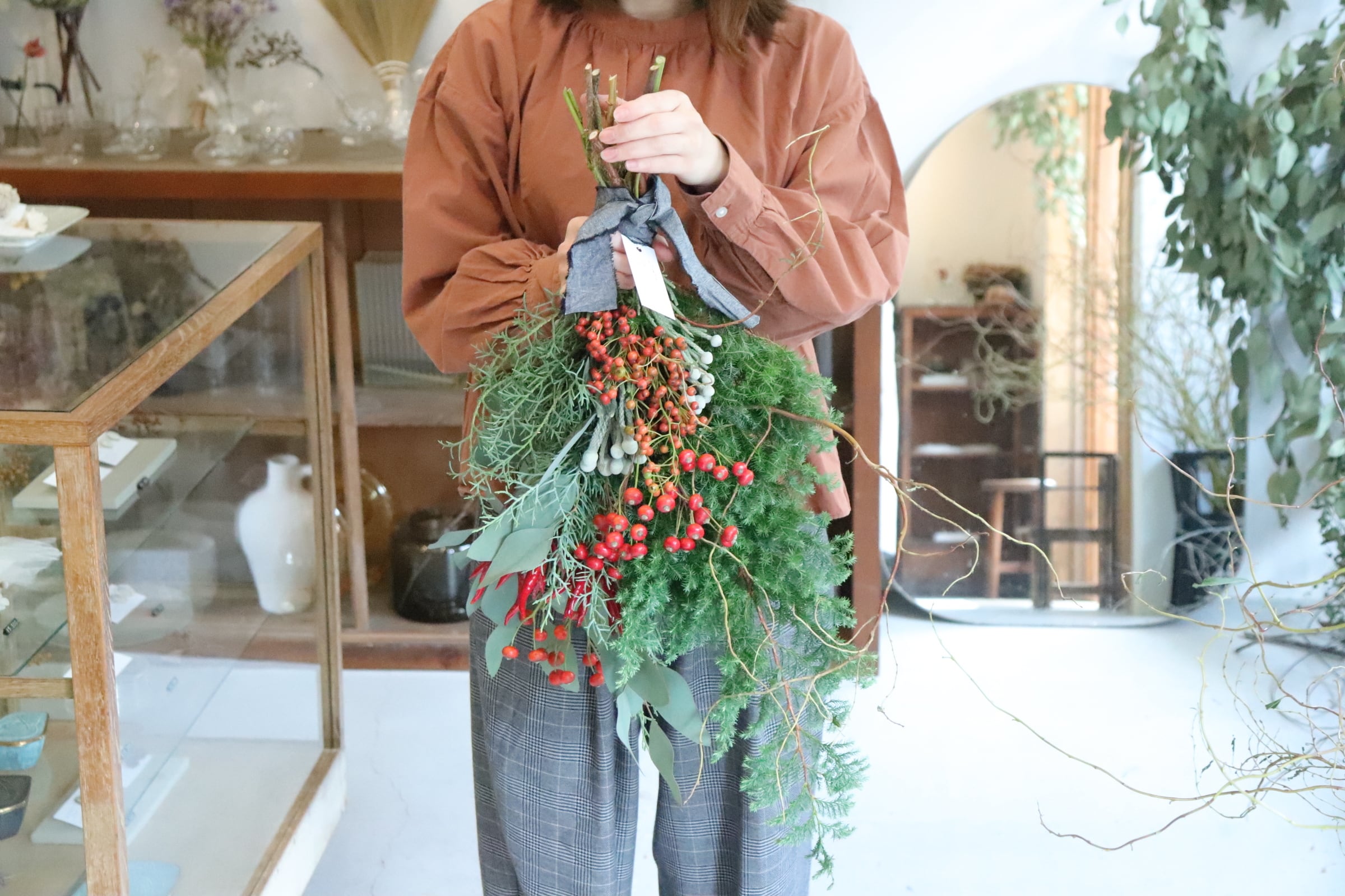 材料: ブルーアイス、ヒムロスギ、ブルーバード、シルバーブルニア、ユーカリ、とうがらし、バラの実、野ばら